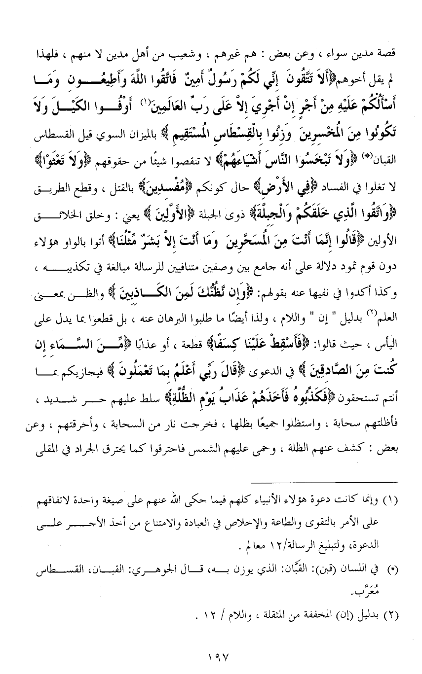 قصة مدين سواء، وعن بعض: هم غيرهم، وشعيب من أهل مدين لا منهم، فلهذا لم يقل أخوهم (أَلَا تَتَّقُونَ (177) إِنِّي لَكُمْ رَسُولٌ أَمِينٌ (178) فَاتَّقُوا اللهَ وَأَطِيعُونِ (179) وَمَا أَسْأَلُكُمْ عَلَيْهِ مِنْ أَجْرٍ إِنْ أَجْرِيَ إِلَّا عَلَى رَبِّ الْعَالَمِينَ (180) أَوْفُوا الْكَيْلَ وَلَا تَكُونُوا مِنَ الْمُخْسِرِينَ (181) وَزِنُوا بِالْقِسْطَاسِ الْمُسْتَقِيمِ) بالميزان السوي قيل القسطاس القبان (وَلاَ تَبْخسُوا النَّاسَ أَشْيَاءَهُمْ) لا تنقصوا شيئًا من حقوقهم (وَلاَ تَعْثَوْا) لا تغلوا في الفساد (في الأَرْضِ) حال كونكم (مُفسِدِينَ) بالقتل، وقطع الطريق (وَاتَّقُوا الَّذِي خَلَقَكُمْ وَالْجِبِلَّةَ) ذوى الجبلة (الْأَوَّلِينَ) يعني: وخلق الخلائق الأولين (قَالُوا إِنَّمَا أَنْتَ مِنَ الْمُسَحَّرِينَ وَمَا أَنْتَ إِلَّا بَشَرٌ مِثْلُنَا) أتوا بالواو هؤلاء دون قوم ثمود دلالة على أنه جامع بين وصفين متنافيين للرسالة مبالغة في تكذيبه، وكذا أكدوا في نفيها عنه بقولهم: (وَإِن نَّظُنُّكَ لَمِنَ الكَاذِبِينَ) والظن بمعنى العلم بدليل " إنْ " واللام، ولذا أيضًا ما طلبوا البرهان عنه، بل قطعوا بما يدل على اليأس، حيث قالوا: (فَأَسْقِطْ عَلَيْنَا كِسَفًا) قطعة، أو عذابًا (مِّنَ السَّمَاءِ إِن كنتَ مِنَ الصَّادقِينَ) في الدعوى (قَالَ رَبِّي أَعْلَمُ بِمَا تَعْمَلُونَ) فيجازيكم بما أنتم تستحقون (فَكَذَّبُوهُ فَأَخَذَهُمْ عَذَابُ يَوْمِ الظُّلَّةِ) سلط عليهم حر شديد، فأظلتهم سحابة، واستظلوا جميعًا بظلها، فخرجت نار من السحابة، وأحرقتهم، وعن بعض: كشف عنهم الظلة، وحمى عليهم الشمس فاحترقوا كما يحترق الجراد في المقلى