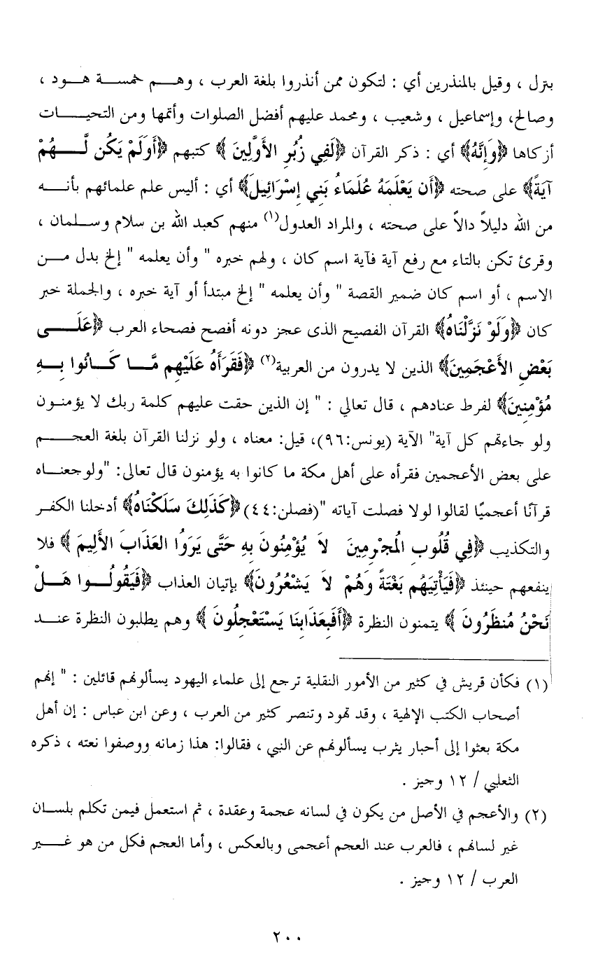 بـ نزل، وقيل بالمنذرين أي: لتكون ممن أنذروا بلغة العرب، وهم خمسة هود، وصالح، وإسماعيل، وشعيب، ومحمد عليهم أفضل الصلوات وأتمها ومن التحيات أزكاها (وَإِنَّهُ) أي: ذكر القرآن (لَفِي زُبُرِ الْأَوَّلِينَ) كتبهم (أَوَلَمْ يَكُنْ لَهُمْ آيَةً) على صحته (أَنْ يَعْلَمَهُ عُلَمَاءُ بَنِي إِسْرَائِيلَ) أي: أليس علم علمائهم بأنه من الله دليلاً دالاً على صحته، والمراد العدول منهم كعبد الله بن سلام وسلمان، وقرئ تكن بالتاء مع رفع آية فآية اسم كان، ولهم خبره " وأن يعلمه " إلخ بدل من الاسم، أو اسم كان ضمير القصة " وأن يعلمه " إلخ مبتدأ أو آية خبره، والجملة خبر كان (وَلَوْ نَزَّلْنَاهُ) القرآن الفصيح الذي عجز دونه أفصح فصحاء العرب (عَلَى بَعْضِ الْأَعْجَمِينَ) الذين لا يدرون من العربية (فَقَرَأَهُ عَلَيْهِمْ مَا كَانُوا بِهِ مُؤْمِنِينَ) لفرط عنادهم، قال تعالي: (إِنَّ الَّذِينَ حَقَّتْ عَلَيْهِمْ كَلِمَتُ رَبِّكَ لَا يُؤْمِنُونَ (96) وَلَوْ جَاءَتْهُمْ كُلُّ آيَةٍ) الآية [يونس: 96]، قيل: معناه، ولو نزلنا القرآن بلغة العجم على بعض الأعجمين فقرأه على أهل مكة ما كانوا به يؤمنون قال تعالى: (وَلَوْ جَعَلْنَاهُ قُرْآنًا أَعْجَمِيًّا لَقَالُوا لَوْلَا فُصِّلَتْ آيَاتُهُ) [فصلت: 44] (كَذَلِكَ سَلَكنَاهُ) أدخلنا الكفر والتكذيب (فِي قُلُوبِ الْمُجْرِمِينَ لَا يُؤْمِنُونَ بِهِ حَتَّى يَرَوُا الْعَذَابَ الْأَلِيمَ) فلا ينفعهم حينئذ (فَيَأْتِيَهم بَغْتَةً وَهُمْ لَا يَشْعُرُون) بإتيان العذاب (فَيَقُولُوا هَلْ نَحْنُ مُنْظَرُونَ) يتمنون النظرة (أَفَبِعَذَابِنَا يَسْتَعْجِلُونَ) وهم يطلبون النظرة عند