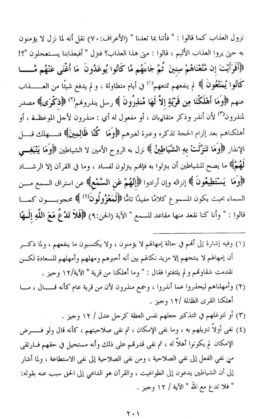 نزول العذاب كما قالوا: " فأتنا بما تعدنا " [الأعراف: 70] نقل أنه لما نزل لا يؤمنون به حتى يروا العذاب الأليم، قالوا: متى هذا العذاب؟ فنزل " أفبعذابنا يستعجلون "؟! (أَفَرَأَيْتَ إِنْ مَتَّعْنَاهُمْ سِنِينَ ثُمَّ جَاءَهُمْ مَا كَانُوا يُوعَدُونَ مَا أَغْنَى عَنْهُمْ مَا كَانُوا يُمَتَّعُونَ) أينفعهم تمتعهم في أيام متطاولة، ولم يدفع شيئًا من العذاب عنهم (وَمَا أَهْلَكْنَا مِنْ قَرْيَةٍ إِلَّا لَهَا مُنْذِرُونَ) رسل ينذرونهم (ذِكْرَى) مصدر لـ منذرون لأن أنذر وذكر متقاربان، أو مفعول له أي: منذرون لأجل الموعظة، أو أهلكناهم بعد إلزام الحجة تذكره وعبرة لغيرهم (وَمَا كُنَّا ظَالِمِينَ) فنهلك قبل الإنذار (وَمَا تَنَزَّلَتْ بِهِ الشَّيَاطِينُ) نزل به الروح الأمين لا الشياطين (وَمَا يَنْبَغِي لَهُمْ) ما يصح للشياطين أن ينزلوا به فإنهم ينزلون للفساد، وما في القرآن إلا الرشاد (وَمَا يَسْتَطِيعُونَ) إنزاله وإن أرادوا (إِنَّهُمْ عَنِ السَّمْع) عن استراق السمع من السماء بحيث يكون المسموع كلامًا مفيدًا تامًّا (لَمَعْزُولُونَ) محجوبون كما قالوا: (وأنا كنا نقعد منها مقاعد للسمع) الآية [الجن: 9] (فَلَا تَدْعُ مَعَ اللهِ إِلَهًا