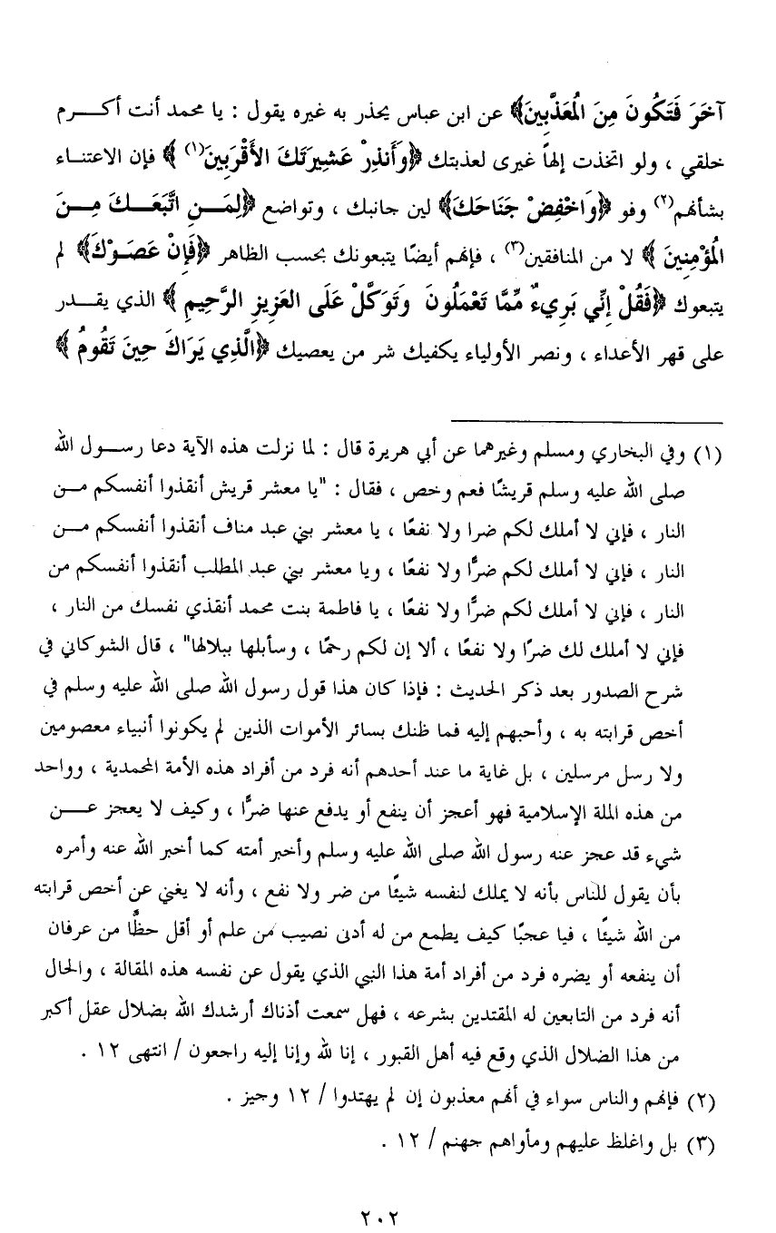 آخَرَ فَتَكُونَ مِنَ الْمُعَذَّبِينَ) عن ابن عباس يحذر به غيره يقول: يا محمد أنت أكرم خلقي، ولو اتخذت إلهًا غيري لعذبتك (وَأَنذِرْ عَشِيرَتَكَ الأَقْرَبِينَ) فإن الاعتناء بشأنهم [أهم] (1) (وَاخْفِضْ جَنَاحَكَ) لين جانبك، وتواضع (لِمَنِ اتَّبَعَكَ مِنَ الْمُؤْمِنِينَ) لا من المنافقين، فإنهم أيضًا يتبعونك بحسب الظاهر (فَإِنْ عَصَوْكَ) لم يتبعوك (فَقُلْ إِنِّي بَرِيءٌ مِمَّا تَعْمَلُونَ وَتَوَكَّلْ عَلَى الْعَزِيزِ الرَّحِيمِ) الذي يقدر على قهر الأعداء، ونصر الأولياء يكفيك شر من يعصيك (الَّذِي يَرَاكَ حِينَ تَقُومُ)