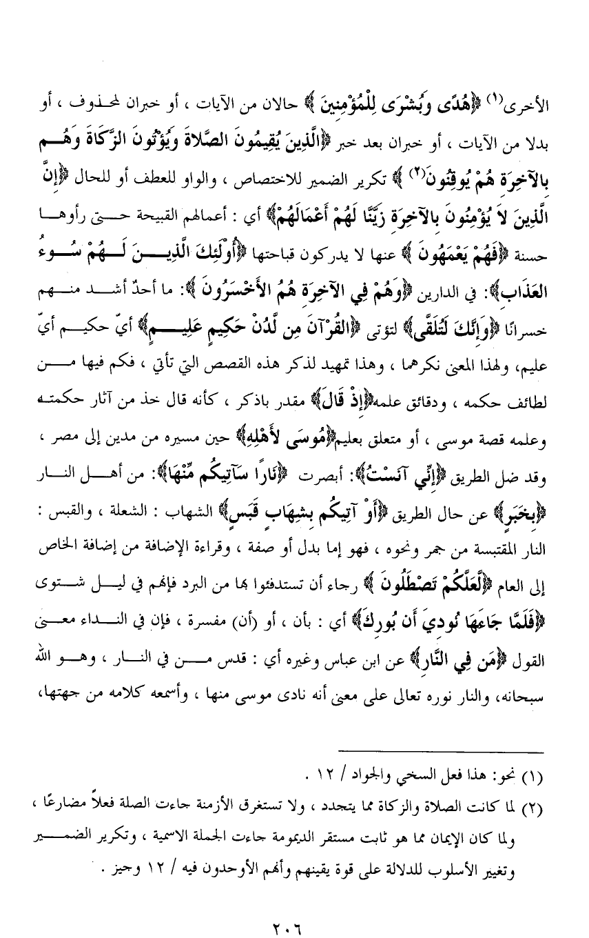 الأخرى (هُدًى وَبُشْرَى لِلْمُؤْمِنينَ) حالان من الآيات، أو خبران لمحذوف، أو بدلاً من الآيات، أو خبران بعد خبر (الَّذِينَ يُقِيمُونَ الصَّلَاةَ وَيُؤْتُونَ الزَّكَاةَ وَهُمْ بِالْآخِرَةِ هُمْ يُوقِنُونَ) تكرير الضمير للاختصاص، والواو للعطف أو للحال (إِنَّ الَّذِينَ لَا يُؤْمِنُونَ بِالْآخِرَةِ زَيَّنَّا لَهُمْ أَعْمَالَهُمْ) أي: أعمالهم القبيحة حتى رأوها حسنة (فَهُمْ يَعْمَهُونَ) عنها لا يدركون قباحتها (أُولَئِكَ الَّذِينَ لَهُمْ سُوءُ العَذَاب): في الدارين (وَهُمْ فِي الْآخِرَةِ هُمُ الأَخْسَرُونَ): ما أحدٌ أشد منهم خسرانًا (وَإِنَّكَ لَتُلَقَّى) لتؤتى (الْقُرْآنَ مِنْ لَدُنْ حَكِيمٍ عَلِيمٍ) أي حكيم أيّ عليم، ولهذا المعنى نكرهما، وهذا تمهيد لذكر هذه القصص التي تأتي، فكم فيها من لطائف حكمه، ودقائق علمه (إِذ قَالَ) مقدر باذكر، كأنه قال خذ من آثار حكمته وعلمه قصة موسى، أو متعلق بـ عليم (مُوسَى لأَهْلِهِ) حين مسيره من مدين إلى مصر، وقد ضل الطريق (إِنِّي آنسْتُ): أبصرت (نَارًا سَآتِيكُم مِّنْهَا): من أهل النار (بِخَبَرٍ) عن حال الطريق (أَوْ آتِيكُم بِشِهَابٍ قَبَسٍ) الشهاب: الشعلة، والقبس: النار المقتبسة من جمر ونحوه، فهو إما بدل أو صفة، وقراءة الإضافة من إضافة الخاص إلى العام (لَعَلَّكُمْ تَصْطَلُونَ) رجاء أن تستدفئوا بها من البرد فإنهم في ليل شتوي (فَلَمَّا جَاءَهَا نُودِيَ أَنْ بُورِكَ) أي: بأن، أو (أن) مفسرة، فإن في النداء معنى القول (مَنْ في النَّارِ) عن ابن عباس وغيره أي: قدس من في النار، وهو الله سبحانه، والنار نوره تعالى على معنى أنه نادى موسى منها، وأسمعه كلامه من جهتها،