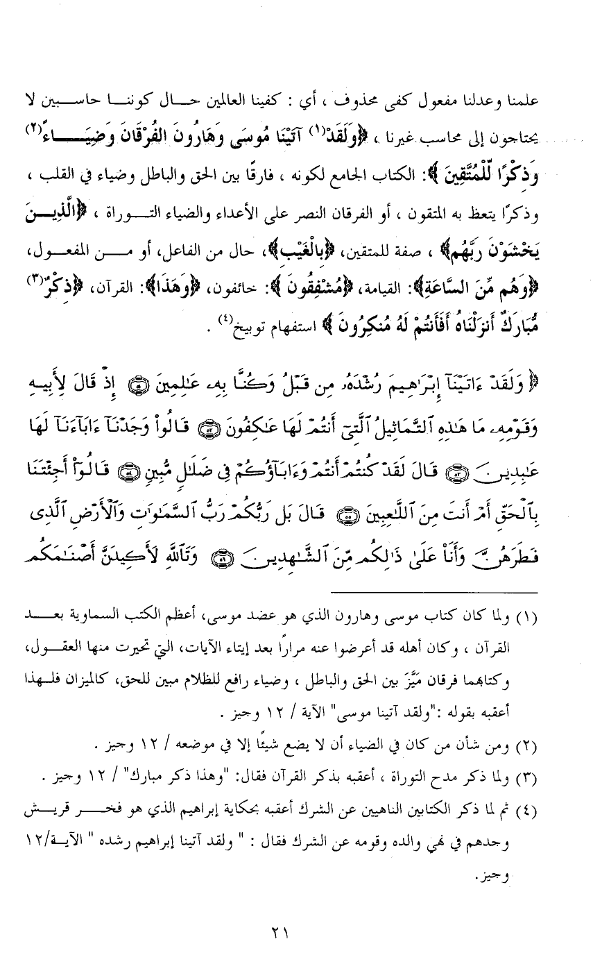 علمنا وعدلنا مفعول كفى محذوف، أي: كفينا العالمين حال كوننا حاسبين لا يحتاجون إلى محاسب غيرنا، (وَلَقَدْ آتَيْنَا مُوسَى وَهَارُونَ الْفُرْقَانَ وَضِيَاءً وَذِكْرًا لِلْمُتَّقِينَ). الكتاب الجامع لكونه، فارقا بين الحق والباطل وضياء في القلب، وذكرًا يتعظ به المتقون، أو الفرقان النصر على الأعداء والضياء التوراة، (الَّذِينَ يَخْشَوْنَ رَبَّهُمْ)، صفة للمتقين، (بِالْغَيْبِ)، حال من الفاعل، أو من المفعول، (وَهُمْ مِنَ السَّاعَةِ): القيامة، (مُشْفِقُونَ): خائفون، (وَهذَا): القرآن، (ذِكْرٌ مُبَارَكٌ أَنْزَلْنَاهُ أَفَأَنْتُمْ لَهُ مُنْكِرُونَ) استفهام توبيخ.