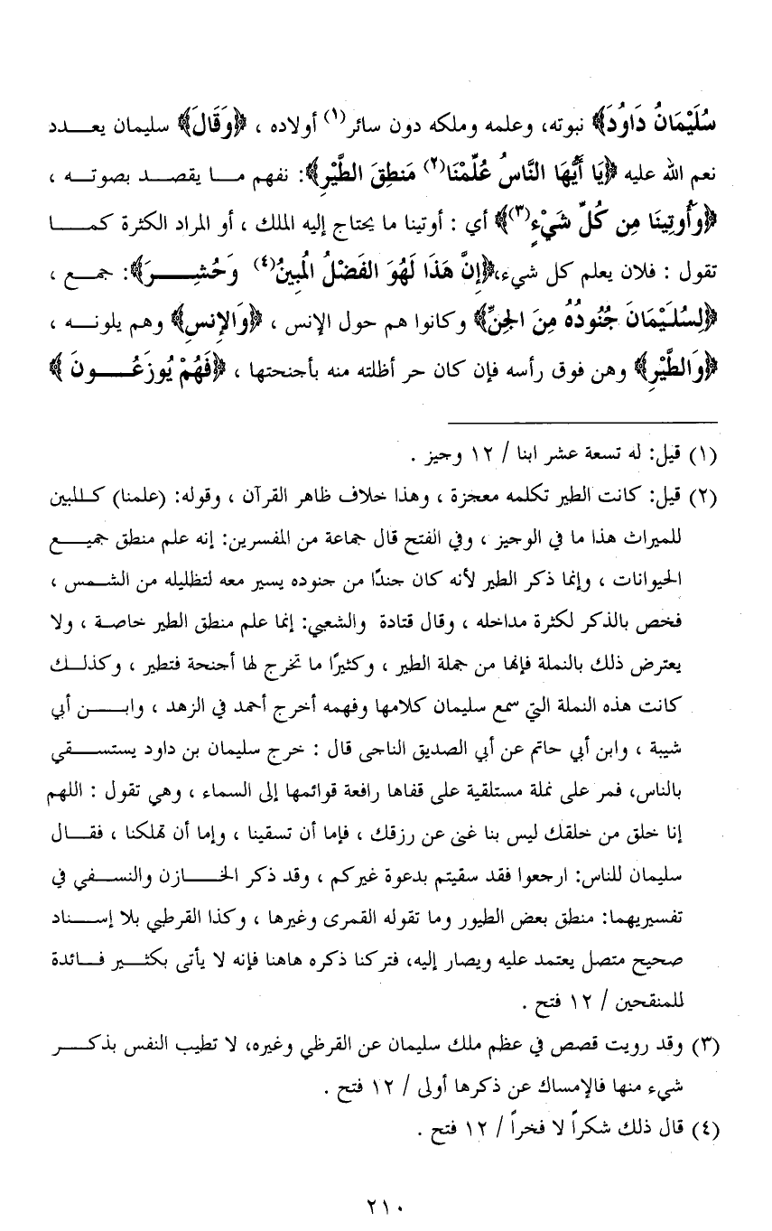 سُلَيْمَانُ دَاوُودَ) نبوته، وعلمه وملكه دون سائر أولاده، (وَقَالَ) سليمان يعدد نعم الله عليه (يَا أَيُّهَا النَّاسُ عُلِّمْنَا مَنْطِقَ الطَّيْرِ): نفهم ما يقصد بصوته، (وَأُوتِينَا مِنْ كُلِّ شَيْءٍ) أي: أوتينا ما يحتاج إليه الملك، أو المراد الكثرة كما تقول: فلان يعلم كل شيء، (إِن هَذَا لَهُوَ الفَضْلُ المُبِينُ وَحُشِرَ): جمع، (لِسُلَيْمَانَ جُنُودُهُ مِنَ الْجِنِّ) وكانوا هم حول الإنس، (وَالإنسِ) وهم يلونه، (وَالطيْرِ) وهن فوق رأسه فإن كان حر أظلته منه بأجنحتها، (فهُمْ يُوزَعُون)