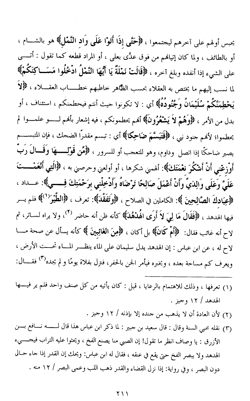 يحبس أولهم على آخرهم ليجتمعوا، (حَتَّى إِذَا أَتَوْا عَلَى وَادِ النَّمْلِ) هو بالشام، أو بالطائف، ولما كان إتيانهم من فوق عدَّي بعلى، أو المراد قطعه كما تقول: أتى على الشيء إذا أنفده وبلغ آخره، (قَالَتْ نَمْلَةٌ يَا أَيُّهَا النَّمْلُ ادْخُلُوا مَسَاكِنَكُمْ) لما نسب إليهم ما يختص به العقلاء بحسب الظاهر خاطبهم خطاب العقلاء، (لاَ يَحْطِمَنَّكُمْ سُلَيْمَانُ وَجُنُودُهُ) أي: لا تكونوا حيث أنتم ليحطمنكم، استئناف، أو بدل من الأمر، (وَهُمْ لَا يَشْعُرُون) أنَّهم يحطمونكم، فيه إشعار بأنَّهم لو علموا لم يحطموا؛ لأنَّهُم جنود نبي، (فتَبَسَّمَ ضَاحِكًا) أي: تبسم مقدرًّا الضحك، فإن المتبسم يصير ضاحكًا إذا اتصل وداوم، وهو للتعجب أو للسرور، (مِّن قَوْلِهَا وَقَالَ رَبِّ أَوْزِعْنِي أَنْ أَشْكُرَ نِعْمَتَكَ): ألهمني شكرها، أو أولعني وحرصني به، (الَّتِي أَنْعَمْتَ عَلَيَّ وَعَلَى وَالِدَيَّ وَأَنْ أَعْمَلَ صَالِحًا تَرْضَاهُ وَأَدْخِلْنِي بِرَحْمَتِكَ فِي): عداد، (عِبَادِكَ الصَّالِحِينَ): الكاملين في الصلاح، (وَتَفَقَّدَ): تعرف، (الطيْرَ) فلم ير فيها الهدهد، (فَقَالَ مَا لِيَ لَا أَرَى الهُدْهُدَ) كأنه ظن أنه حاضر، ولا يراه لساتر، ثم لاح أنه غائب فقال: (أَمْ كانَ) بل أكان، (مِنَ الغَائِبِينَ) كأنه يسأل عن صحة ما لاح له، عن ابن عباس: إن الهدهد يدل سليمان على الماء ينظر الماء تحت الأرض، ويعرف كم مساحة بعده، ويخبره فيأمر الجن بالحفر، فنزل بفلاة يومًا ولم يجده فقال: