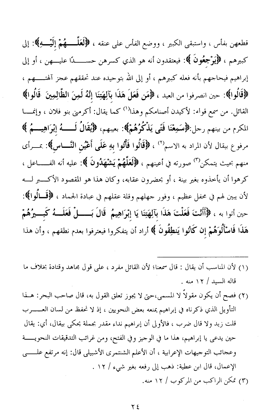 قطعهن بفأس، واستبقى الكبير، ووضع الفأس على عنقه، (لَعَلَّهُمْ إِلَيْهِ): إلى كبيرهم، (يَرْجِعُونَ): فيعتقدون أنه هو الذي كسرهن حسدًا عليهن، أو إلى إبراهيم فيحاجهم بأنه فعله كبيرهم، أو إلى الله بتوحيده عند تحققهم عجز آلهتهم، (قَالُوا): حين انصرفوا من العيد، (مَن فَعَلَ هَذَا بِآلِهَتِنَا إِنَّهُ لَمِنَ الظَّالِمِينَ قَالُوا) القائل. من سمع قوله: (لأكيدن أصنامكم) وهذا كما يقال: أكرمني بنو فلان، وإنما المكرم من بينهم رجل: (سَمِعْنَا فَتًى يَذْكُرُهُمْ): بعيبهم، (يُقَالُ لَهُ إِبْرَاهِيمُ) مرفوع بـ يقال لأن المراد به الاسم، (قَالُوا فَأْتُوا بِهِ عَلَى أَعْيُنِ النَّاسِ): بمرأى منهم بحيث يتمكن صورته في أعينهم، (لَعَلهُمْ يَشْهَدُون): عليه أنه الفاعل، كرهوا أن يأخذوه بغير بينة، أو يحضرون عقابه، وكان هذا هو المقصود الأكبر له لأن يبين لهم في محفل عظيم، وفور جهلهم وقلة عقلهم في عبادة الجماد، (قَالُوا): حين أتوا به، (أَأَنْتَ فَعَلْتَ هَذَا بِآلِهَتِنَا يَا إِبْرَاهِيمُ قَالَ بَلْ فَعَلَهُ كَبِيرُهُمْ هَذَا فَاسْأَلُوهُمْ إِنْ كَانُوا يَنْطِقُونَ) أراد أن يتفكروا فيعترفوا بعدم نطقهم، وأن هذا