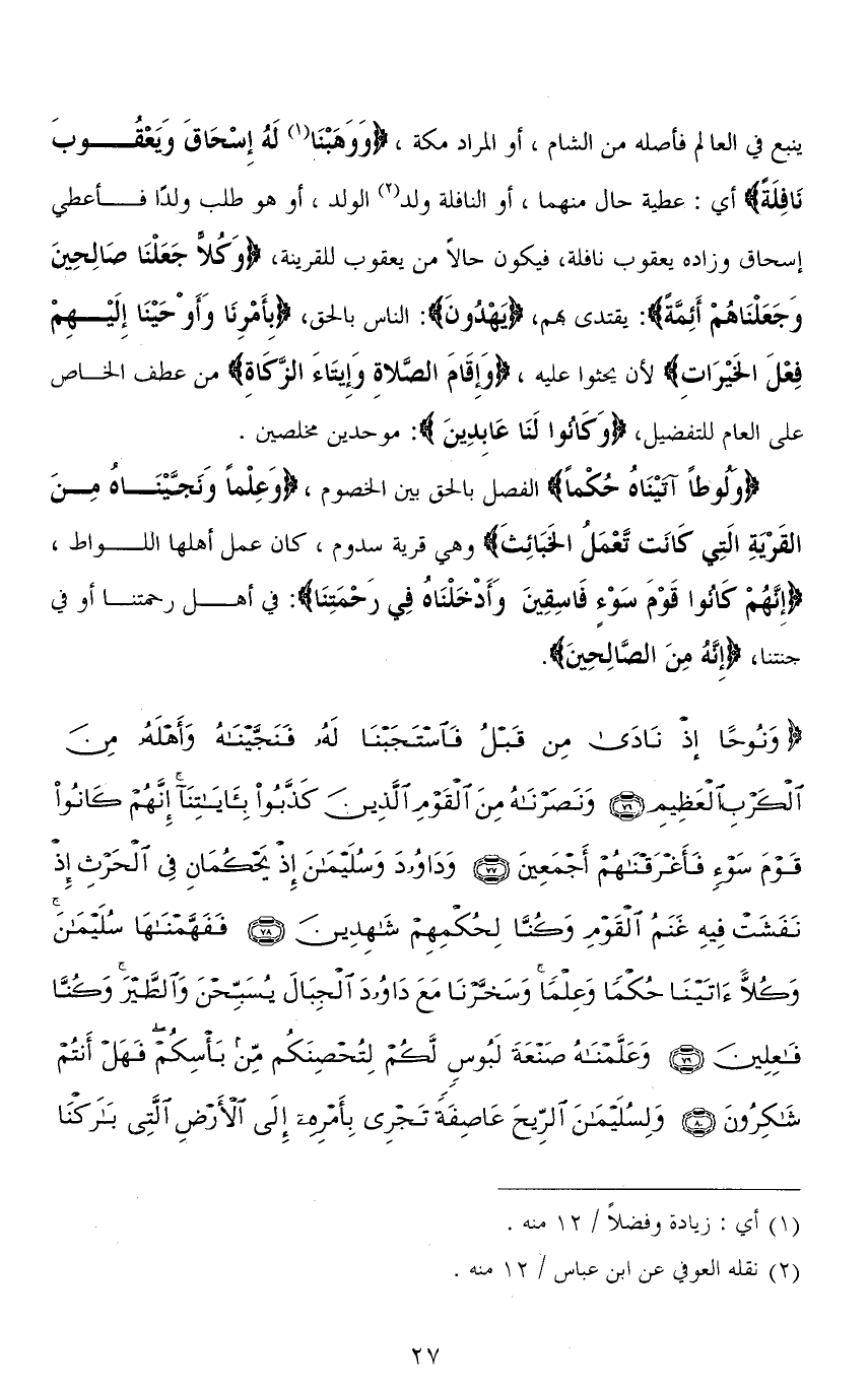 ينبع في العالم فأصله من الشام، أو المراد مكة، (وَوَهَبْنَا لَهُ إِسْحَاقَ وَيَعْقُوبَ نَافِلَةً) أي: عطية حال منهما، أو النافلة ولد الولد، أو هو طلب ولدًا فأعطي إسحاق وزاده يعقوب نافلة، فيكون حالاً من يعقوب للقرينة، (وَكُلًّا جَعَلْنَا صَالِحِينَ وَجَعَلْنَاهمْ أَئِمَّة): يقتدى بهم، (يَهْدُونَ): الناس بالحق، (بِأَمْرِنَا وَأَوْحَيْنَا إِلَيْهِمْ فِعْلَ الخَيْرَاتِ) لأن يحثوا عليه، (وَإِقَامَ الصَّلاةِ وَإِيتَاءَ الزَّكَاةِ) من عطف الخاص على العام للتفضيل، (وَكَانُوا لنا عَابِدِينَ): موحدين مخلصين.