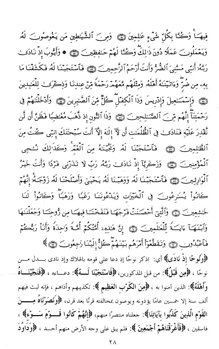 فِيهَا وَكُنَّا بِكُلِّ شَيْءٍ عَالِمِينَ (81) وَمِنَ الشَّيَاطِينِ مَنْ يَغُوصُونَ لَهُ وَيَعْمَلُونَ عَمَلًا دُونَ ذَلِكَ وَكُنَّا لَهُمْ حَافِظِينَ (82) وَأَيُّوبَ إِذْ نَادَى رَبَّهُ أَنِّي مَسَّنِيَ الضُّرُّ وَأَنْتَ أَرْحَمُ الرَّاحِمِينَ (83) فَاسْتَجَبْنَا لَهُ فَكَشَفْنَا مَا بِهِ مِنْ ضُرٍّ وَآتَيْنَاهُ أَهْلَهُ وَمِثْلَهُمْ مَعَهُمْ رَحْمَةً مِنْ عِنْدِنَا وَذِكْرَى لِلْعَابِدِينَ (84) وَإِسْمَاعِيلَ وَإِدْرِيسَ وَذَا الْكِفْلِ كُلٌّ مِنَ الصَّابِرِينَ (85) وَأَدْخَلْنَاهُمْ فِي رَحْمَتِنَا إِنَّهُمْ مِنَ الصَّالِحِينَ (86) وَذَا النُّونِ إِذْ ذَهَبَ مُغَاضِبًا فَظَنَّ أَنْ لَنْ نَقْدِرَ عَلَيْهِ فَنَادَى فِي الظُّلُمَاتِ أَنْ لَا إِلَهَ إِلَّا أَنْتَ سُبْحَانَكَ إِنِّي كُنْتُ مِنَ الظَّالِمِينَ (87) فَاسْتَجَبْنَا لَهُ وَنَجَّيْنَاهُ مِنَ الْغَمِّ وَكَذَلِكَ نُنْجِي الْمُؤْمِنِينَ (88) وَزَكَرِيَّا إِذْ نَادَى رَبَّهُ رَبِّ لَا تَذَرْنِي فَرْدًا وَأَنْتَ خَيْرُ الْوَارِثِينَ (89) فَاسْتَجَبْنَا لَهُ وَوَهَبْنَا لَهُ يَحْيَى وَأَصْلَحْنَا لَهُ زَوْجَهُ إِنَّهُمْ كَانُوا يُسَارِعُونَ فِي الْخَيْرَاتِ وَيَدْعُونَنَا رَغَبًا وَرَهَبًا وَكَانُوا لَنَا خَاشِعِينَ (90) وَالَّتِي أَحْصَنَتْ فَرْجَهَا فَنَفَخْنَا فِيهَا مِنْ رُوحِنَا وَجَعَلْنَاهَا وَابْنَهَا آيَةً لِلْعَالَمِينَ (91) إِنَّ هَذِهِ أُمَّتُكُمْ أُمَّةً وَاحِدَةً وَأَنَا رَبُّكُمْ فَاعْبُدُونِ (92) وَتَقَطَّعُوا أَمْرَهُمْ بَيْنَهُمْ كُلٌّ إِلَيْنَا رَاجِعُونَ (93)