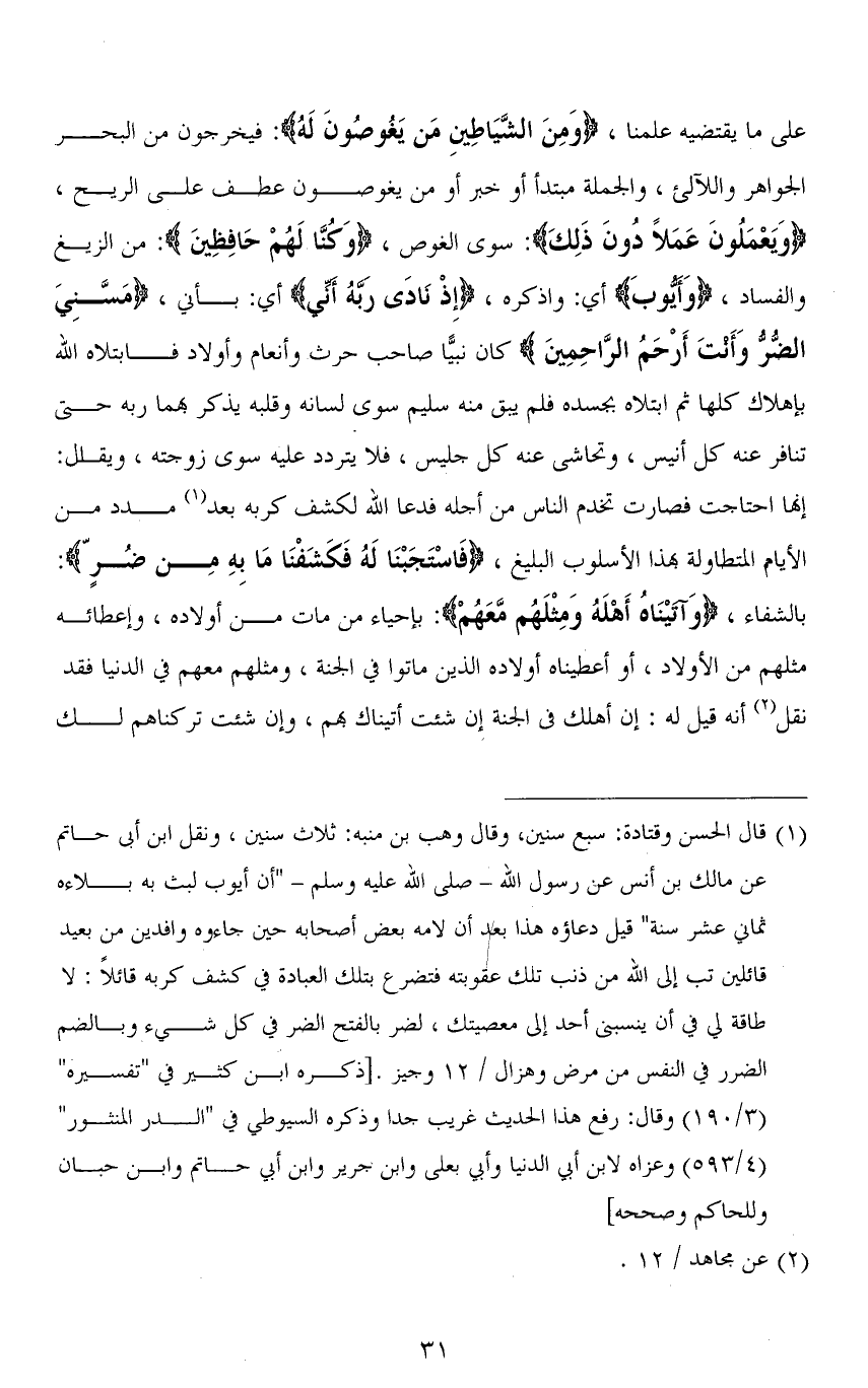 على ما يقتضيه علمنا، (وَمِنَ الشَّيَاطِينِ مَنْ يَغُوصُونَ لَهُ): فيخرجون من البحر الجواهر واللآلئ، والجملة مبتدأ أو خبر أو من يغوصون عطف على الريح، (وَيَعْمَلُونَ عَمَلاً دُونَ ذَلِكَ): سوى الغوص، (وَكُنَّا لَهُمْ حَافِظِينَ): من الزيغ والفساد، (وَأَيُّوبَ) أي: واذكره، (إِذْ نَادَى رَبَّهُ أَنِّي) أي: بأني، (مَسَّنِيَ الضُّرُّ وَأَنْتَ أَرْحَمُ الرَّاحِمِينَ) كان نبيًّا صاحب حرث وأنعام وأولاد فابتلاه الله بإهلاك كلها ثم ابتلاه بجسده فلم يبق منه سليم سوى لسانه وقلبه يذكر بهما ربه حتى تنافر عنه كل أنيس، وتحاشى عنه كل جليس، فلا يتردد عليه سوى زوجته، ويقال: إنها احتاجت فصارت تخدم الناس من أجله فدعا الله لكشف كربه بعد مدد من الأيام المتطاولة بهذا الأسلوب البليغ، (فَاسْتَجَبْنَا لَهُ فَكَشَفْنَا مَا بِهِ مِنْ ضُرٍّ): بالشفاء، (وَآتَيْنَاهُ أَهْلَهُ وَمِثْلَهُمْ مَعَهُمْ): بإحياء من مات من أولاده، وإعطائه مثلهم من الأولاد، أو أعطيناه أولاده الذين ماتوا في الجنة، ومثلهم معهم في الدنيا فقد نقل أنه قيل له: إن أهلك في الجنة إن شئت أتيناك بهم، وإن شئت تركناهم لك