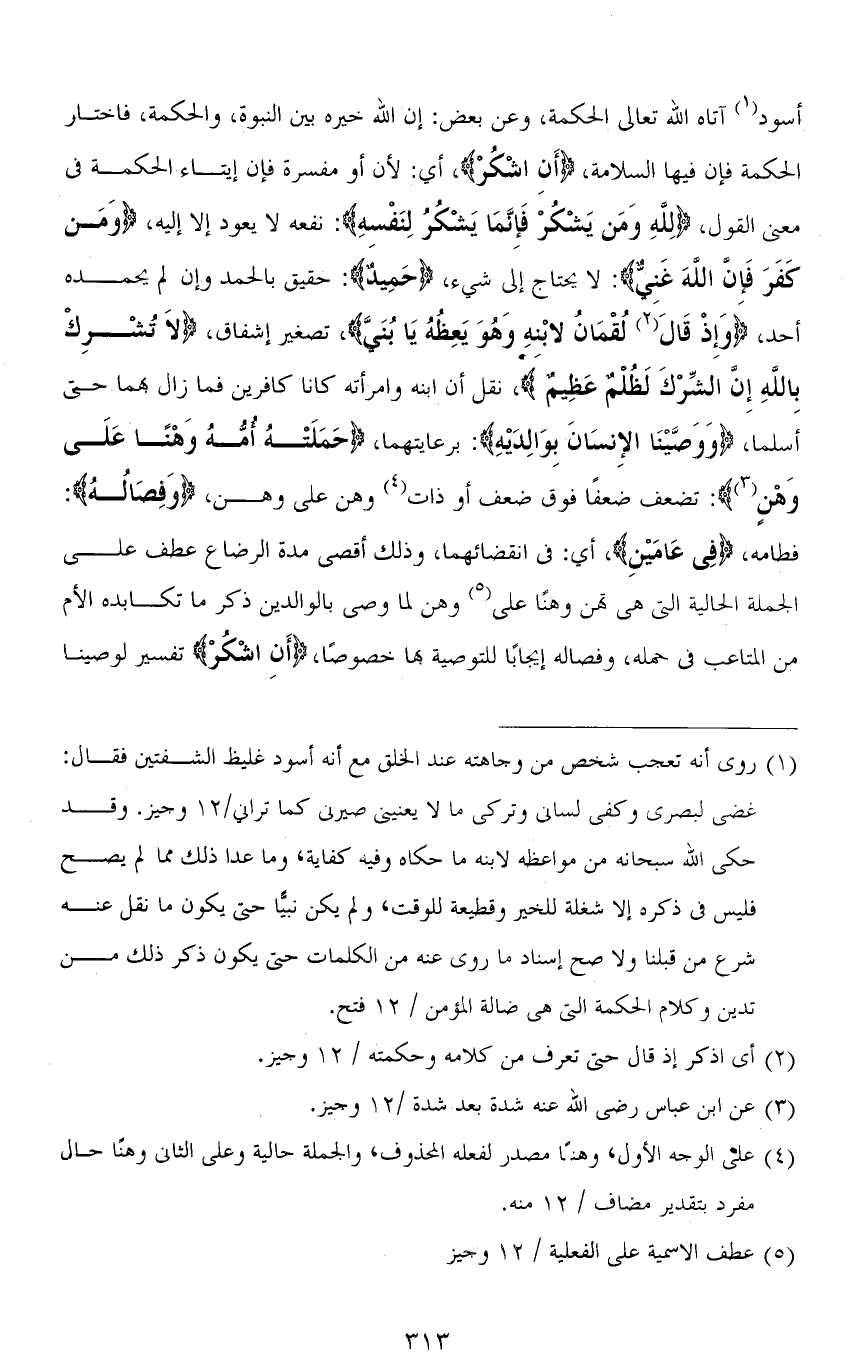 أسود آتاه الله تعالى الحكمة، وعن بعض: إن الله خيره بين النبوة، والحكمة، فاختار الحكمة فإن فيها السلامة، (أَنِ اشْكُرْ)، أي: لأن أو مفسرة فإن إيتاء الحكمة في معنى القول، (لله وَمَن يَشْكُرْ فَإِنَّمَا يَشْكُرُ لِنَفْسِهِ): نفعه لا يعود إلا إليه، (وَمَن كَفَرَ فَإِنَّ الله غَنِي): لا يحتاج إلى شيء، (حَمِيدٌ): حقيق بالحمد وإن لم يحمده أحد، (وَإِذْ قَالَ لُقْمَانُ لِابْنِهِ وَهُوَ يَعِظُهُ يَا بُنَيَّ)، تصغير إشفاق، (لَا تُشْرِكْ بِاللهِ إِنَّ الشِّرْكَ لَظُلْمٌ عَظِيمٌ)، نقل أن ابنه وامرأته كانا كافرين فما زال بهما حتى أسلما، (وَوَصَّيْنَا الإِنسَانَ بِوَالِدَيْهِ): برعايتهما، (حَمَلَتْهُ أُمُّهُ وَهْنًا عَلَى وَهْنٍ): تضعف ضعفًا فوق ضعف أو ذات وهن على وهن، (وَفِصَالُهُ): فطامه، (فِى عَامَيْنِ)، أي: في انقضائهما، وذلك أقصى مدة الرضاع عطف على الجملة الحالية التي هي تهن وهنًا على وهن لما وصى بالوالدين ذكر ما تكابده الأم من المتاعب في حمله، وفصاله إيجابًا للتوصية بها خصوصًا، (أَنِ اشْكُرْ) تفسير لوصينا