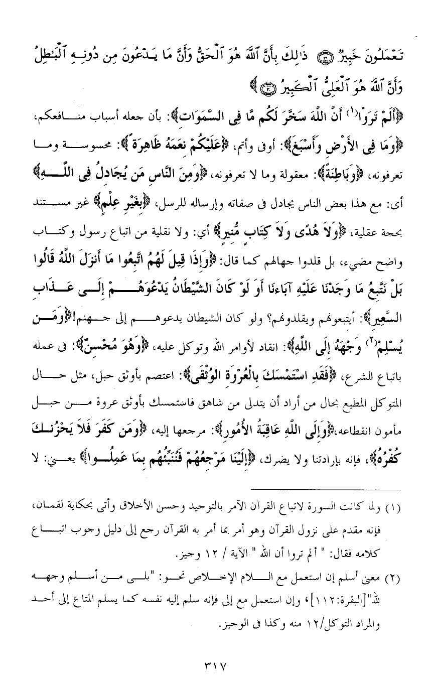 (أَلَمْ تَرَوْا أَن الله سَخَّرَ لَكُم مَّا في السَّمَاوَاتِ): بأن جعله أسباب منافعكم، (وَمَا فِي الأَرْضِ وَأَسْبَغَ): أوفى وأتم، (عَلَيْكُمْ نِعَمَهُ ظَاهِرَةً): محسوسة وما تعرفونه، (وَبَاطِنَةً): معقولة وما لا تعرفونه، (وَمِنَ النَّاسِ مَن يُجَادِلُ فِي اللهِ) أى: مع هذا بعض الناس يجادل في صفاته وإرساله للرسل، (بِغَيْرِ عِلْمٍ) غير مستند بحجة عقلية، (وَلاَ هُدًى وَلاَ كتابٍ منِيرٍ) أي: ولا نقلية من اتباع رسول وكتاب واضح مضيء، بل قلدوا جهالهم كما قال: (وَإِذَا قِيلَ لَهُمُ اتَّبِعُوا مَا أَنزَلَ اللهُ قَالُوا بَلْ نَتَّبِعُ مَا وَجَدْنَا عَلَيْهِ آباءنَا أَوَلَوْ كَانَ الشَّيْطَانُ يَدْعُوَهُمْ إِلَى عَذَابِ السَّعِيرِ): أيتبعونهم ويقلدونهم؟ ولو كان الشيطان يدعوهم إلى جهنم! (وَمَن يُسْلِمْ وَجْهَهُ إِلَى اللهِ): انقاد لأوامر الله وتوكل عليه، (وَهُوَ مُحْسِنٌ): في عمله باتباع الشرع، (فقَدِ استمسَكَ بِالْعُرْوَةِ الوُثْقَى): اعتصم بأوثق حبل، مثل حال المتوكل المطيع بحال من أراد أن يتدلى من شاهق فاستمسك بأوثق عروة من حبل مأمون انقطاعه، (وَإِلَى اللهِ عَاقِبَةُ الأمورِ): مرجعها إليه، (وَمَن كَفَرَ فَلاَ يَحْزُنكَ كُفْرُهُ)، فإنه بإرادتنا ولا يضرك، (إِلَيْنَا مَرْجِعُهُمْ فَنُنَبِّئُهُمْ بِمَا عَمِلُوا) يعني: