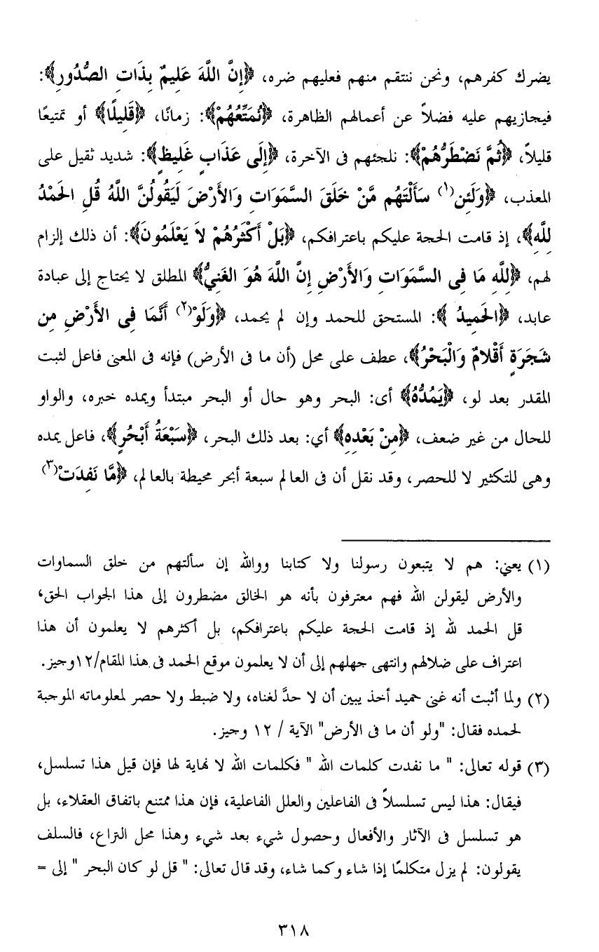 لا يضرك كفرهم، ونحن ننتقم منهم فعليهم ضره، (إِن اللهَ عَلِيمٌ بذَات الصُّدُورِ): فيجازيهم عليه فضلاً عن أعمالهم الظاهرة، (نمَتِّعُهُمْ): زمانًا، (قليلاً) أو تمتيعًا قليلاً، (ثُمَّ نَضْطَرُّهُمْ): نلجئهم في الآخرة، (إِلَى عَذَابٍ غَلِيظٍ): شديد ثقيل على المعذب، (وَلَئِنْ سَأَلْتَهُمْ مَنْ خَلَقَ السَّمَاوَاتِ وَالْأَرْضَ لَيَقُولُنَّ اللهُ قُلِ الْحَمْدُ لله)، إذ قامت الحجة عليكم باعترافكم، (بَلْ أَكْثَرُهُمْ لَا يَعْلَمُونَ): أن ذلك إلزام لهم، (للهِ مَا فِي السَّمَاوَاتِ وَالأَرْضِ إِنَّ اللهَ هُوَ الغَنِيُّ) المطلق لا يحتاج إلى عبادة عابد، (الحَمِيدُ): المستحق للحمد وإن لم يحمد، (وَلَوْ أَنَّمَا فِي الْأَرْضِ مِنْ شَجَرَةٍ أَقْلَامٌ وَالْبَحْرُ)، عطف على محل (أَنَّمَا فِي الْأَرْضِ) فإنه في المعنى فاعل لثبت المقدر بعد لو، (يَمُدُّهُ) أي: البحر وهو حال أو البحر مبتدأ ويمده خبره، والواو للحال من غير ضعف، (مِنْ بَعْدِهِ) أي: بعد ذلك البحر، (سَبْعَةُ أَبْحُرٍ)، فاعل يمده وهى للتكثير لا للحصر، وقد نقل أن في العالم سبعة أبحر محيطة بالعالم، (مَا نَفِدَتْ