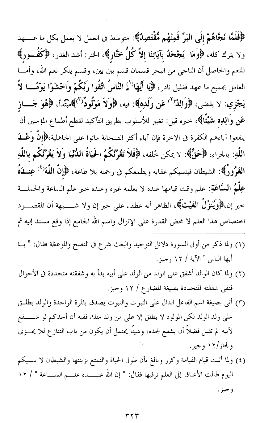 (فَلَمَّا نَجَّاهُمْ إِلَى الْبَرِّ فَمِنْهُمْ مُقْتَصِدٌ): متوسط في العمل لا يعمل بكل ما عهد ولا يترك كله، (وَمَا يَجْحَدُ بِآيَاتِنَا إِلَّا كُلُّ خَتَّارٍ)، الختر: أشد الغدر، (كَفُورٍ) للنعم والحاصل أن الناجي من البحر قسمان قسم بين بين، وقسم ينكر نعم الله، وأما العامل بجميع ما عهد فقليل نادر، (يَا أَيُّهَا النَّاسُ اتَّقُوا رَبَّكُمْ وَاخْشَوْا يَوْمًا لَا يَجْزِي): لا يقضي، (وَالِدٌ عَنْ وَلَدِهِ): فيه، (وَلَا مَوْلُودٌ) مبتدأ، (هُوَ جَازٍ عَنْ وَالِدِهِ شَيْئًا)، خبره قيل: تغيير للأسلوب بطريق التأكيد لقطع أطماع المؤمنين أن ينفعوا آباءهم الكفرة في الآخرة فإن آباء أكثر الصحابة ماتوا على الجاهلية، (إِنَّ وَعْدَ اللهِ): بالجزاء، (حَقٌّ): لا يمكن خُلفه، (فَلَا تَغُرَّنَّكُمُ الْحَيَاةُ الدُّنْيَا وَلَا يَغُرَّنَّكُمْ بِاللهِ الْغَرُورُ): الشيطان فينسيكم عقابه ويطمعكم في رحمته بلا طاعة، (إِنَّ اللهَ عِنْدَهُ عِلْمُ السَّاعَةِ): علم وقت قيامها عنده لا يعلمه غيره وعنده خبر علم الساعة والجملة خبر إنَّ، (وَيُنَزِّلُ الْغَيْثَ)، الظاهر أنه عطف على خبر إن ولا شبهة أن المقصود اختصاص هذا العلم لا محض القدرة على الإنزال واسم الله الجامع إذا وقع مسند إليه ثم