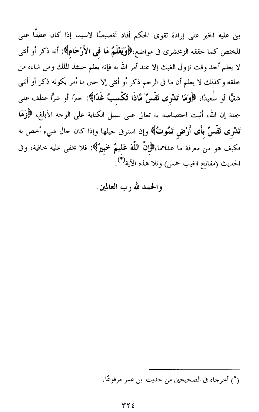 بني عليه الخبر على إرادة تقوى الحكم أفاد تخصيصًا لا سيما إذا كان عطفًا على المختص كما حققه الزمخشري في مواضع، (وَيَعْلَمُ مَا فِي الْأَرْحَامِ): أنه ذكر أو أنثى لا يعلم أحد وقت نزول الغيث إلا عند أمر الله به فإنه يعلم حينئذ الملك ومن شاءه من خلقه وكذلك لا يعلم أن ما في الرحم ذكر أو أنثى إلا حين ما أمر بكونه ذكر أو أنثى شقيًّا أو سعيدًا، (وَمَا تَدْرِي نَفْسٌ مَاذَا تَكْسِبُ غَدًا): خيرًا أو شرًّا عطف على جملة إن الله، أثبت اختصاصه به تعالى على سبيل الكناية على الوجه الأبلغ، (وَمَا تَدْرِي نَفْسٌ بِأَيِّ أَرْضٍ تَمُوتُ) وإن استوفى حيلها وإذا كان حال شيء أخص به فكيف هو من معرفة ما عداهما، (إِنَّ اللهَ عَلِيمٌ خَبِيرٌ): فلا يخفى عليه خافية، وفي الحديث (مفاتح الغيب خمس) وتلا هذه الآية.