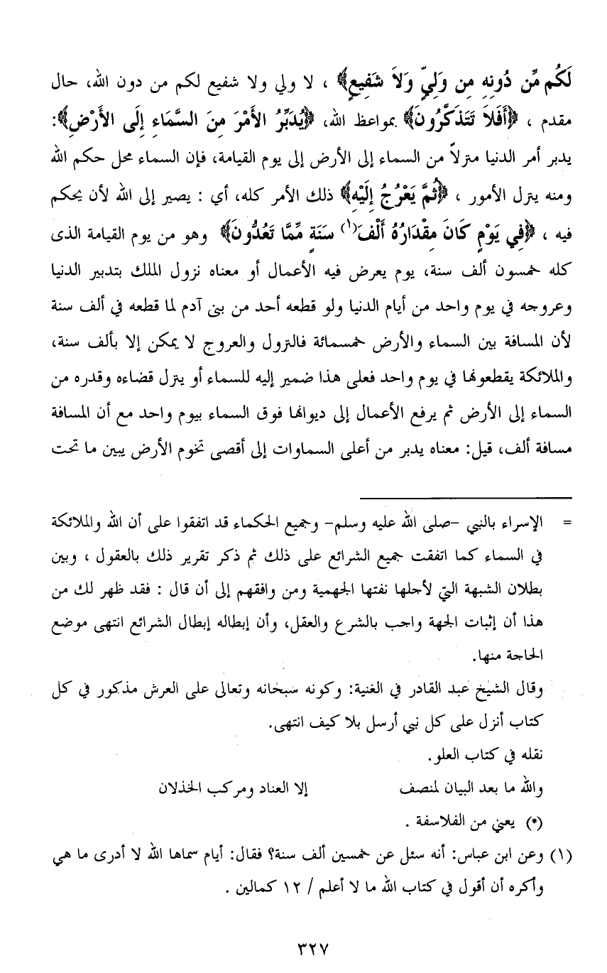 مَا لَكُمْ مِنْ دُونِهِ مِنْ وَلِيٍّ وَلَا شَفِيعٍ)، لا ولي ولا شفيع لكم من دون الله، حال مقدم، (أَفَلَا تَتَذَكَّرُونَ) بمواعظ الله، (يُدَبِّرُ الأَمْرَ مِنَ السَّمَاءِ إِلَى الأَرْضِ): يدبر أمر الدنيا منزلاً من السماء إلى الأرض إلى يوم القيامة، فإن السماء محل حكم الله ومنه ينزل الأمور، (ثُمَّ يَعْرُجُ إِلَيْهِ) ذلك الأمر كله، أي: يصير إلى الله لأن يحكم فيه، (فِي يَوْمٍ كَانَ مِقْدَارُهُ أَلْفَ سَنَةٍ مِمَّا تَعُدُّونَ) وهو من يوم القيامة الذي كله خمسون ألف سنة، يوم يعرض فيه الأعمال أو معناه نزول الملك بتدبير الدنيا وعروجه في يوم واحد من أيام الدنيا ولو قطعه أحد من بني آدم لما قطعه في ألف سنة لأن المسافة بين السماء والأرض خمسمائة فالنزول والعروج لا يمكن إلا بألف سنة، والملائكة يقطعونها في يوم واحد فعلى هذا ضمير إليه للسماء أو ينزل قضاءه وقدره من السماء إلى الأرض ثم يرفع الأعمال إلى ديوانها فوق السماء بيوم واحد مع أن المسافة مسافة ألف، قيل: معناه يدبر من أعلى السماوات إلى أقصى تخوم الأرض يبين ما تحت