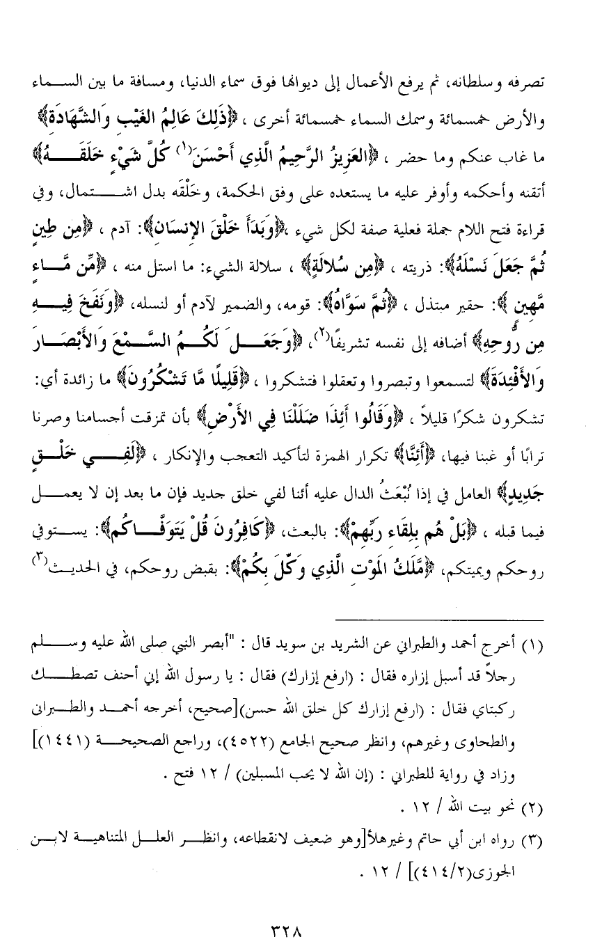 تصرفه وسلطانه، ثم يرفع الأعمال إلى ديوانها فوق سماء الدنيا، ومسافة ما بين السماء والأرض خمسمائة وسمك السماء خمسمائة أخرى، (ذلِكَ عَالِمُ الغَيْبِ وَالشَّهَادَةِ) ما غاب عنكم وما حضر، (العَزِيزُ الرَّحِيمُ الَّذِي أَحْسَنَ كُل شَيْءٍ خَلَقَهُ) أتقنه وأحكمه وأوفر عليه ما يستعده على وفق الحكمة، وخَلْقَه بدل اشتمال، وفي قراءة فتح اللام جملة فعلية صفة لكل شيء، (وَبَدَأَ خَلْقَ الإِنسَانِ): آدم، (مِن طِينٍ ثُمَّ جَعَلَ نَسْلَهُ): ذريه، (مِن سُلالَةٍ)، سلالة الشيء: ما استل منه، (مِّن مَّاءٍ مَّهِين): حقير مبتذل، (ثُمَّ سَوَّاهُ): قوَّمه، والضمير لآدم أو لنسله، (وَنَفَخَ فِيهِ مِنْ رُوحِهِ) أضافه إلى نفسه تشريفًا، (وَجَعَلَ لَكُمُ السَّمْعَ وَالأَبْصَارَ وَالأَفْئِدَةَ) لتسمعوا وتبصروا وتعقلوا فتشكروا، (قَلِيلًا مَا تَشْكُرُونَ) ما زائدة أي: تشكرون شكرًا قليلاً، (وَقَالُوا أَإِذَا ضَلَلْنَا فِي الْأَرْضِ) بأن تمزقت أجسامنا وصرنا ترابًا أو غبنا فيها، (أَإِنَّا) تكرار الهمزة لتأكيد التعجب والإنكار، (لَفِي خَلْقٍ جَدِيدٍ) العامل في إذًا نُبْعَثُ الدال عليه أئنا لفي خلق جديد فإن ما بعد إن لا يعمل فيما قبله، (بَلْ هُمْ بِلِقَاءِ رَبِّهِمْ): بالبعث، (كَافِرُونَ قُلْ يَتَوَفَّاكُمْ): يستوفي روحكم ويميتكم، (مَلَكُ الْمَوْتِ الَّذِي وُكِّلَ بِكُمْ): بقبض روحكم، في الحديث