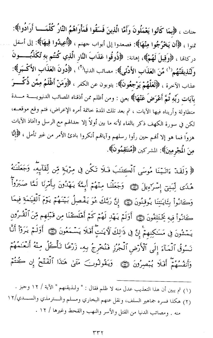 جنات، (بِمَا كَانُوا يَعْمَلُونَ وَأَمَّا الَّذِينَ فَسَقوا فَمَأوَاهُمُ النَّارُ كُلَّمَا أَرَادُوا): تمنوا، (أَنْ يَخرُجُوا مِنْهَا): فصعدوا إلى أبواب جهنم، (أعِيدُوا فِيهَا): إلى أسفل دركاتها، (وَقِيلَ لَهُمْ)، إهانة: (ذُوقُوا عَذَابَ النَّارِ الَّذِي كُنْتُمْ بِهِ تُكَذِّبُونَ وَلَنُذِيقَنَّهُمْ مِنَ الْعَذَابِ الْأَدْنَى): مصائب الدنيا، (دُونَ العَذَابِ الأَكْبَرِ): عذاب الآخرة، (لَعَلَّهُمْ يَرْجِعُونَ): يتوبون عن الكفر، (وَمَنْ أَظْلَمُ مِمَّنْ ذُكِّرَ بِآيَاتِ رَبِّهِ ثُمَّ أَعْرَضَ عَنْهَا) يعني: ومن أظلم ممن أذقناه المصائب الدنيوية مدة متطاولة وأريناه فيها الآيات، ثم بعد تلك الدة خاتمة أمره الإعراض، فثم وقع موقعه، لكن في سورة الكهف ذكر بالفاء لأنه ما بين أولاً إلا جدالهم مع الرسل واتخاذ الآيات هزوًا فما هو إلا أنَّهم حين رأوا رسلهم وآياتهم أنكروا بادئ الأمر من غير تأمل، (إِنَّا مِنَ الْمُجْرِمِينَ): المشركين (مُنْتَقِمُونَ).