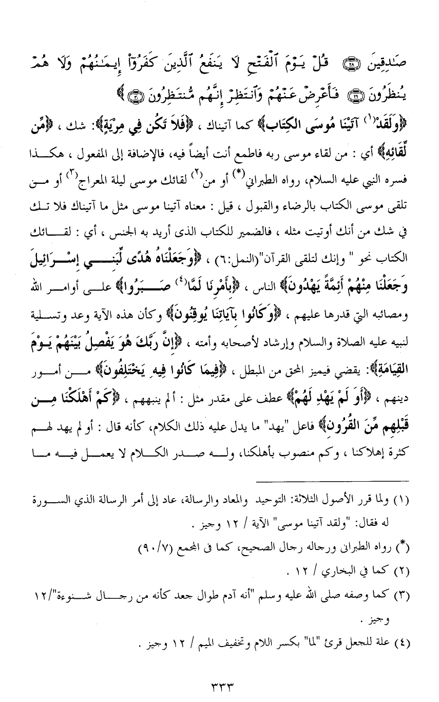 (وَلَقَدْ آتيْنَا مُوسَى الكتاب) كما آتيناك، (فَلاَ تَكُن فِي مِريةٍ): شك، (مِنْ لِقَائِهِ) أي: من لقاء موسى ربه فاطمع أنت أيضًا فيه، فالإضافة إلى المفعول، هكذا فسره النبي عليه السلام، رواه الطبراني أو من لقائك موسى ليلة المعراج أو من تلقى موسى الكتاب بالرضاء والقبول، قيل: معناه آتينا موسى مثل ما آتيناك فلا تك في شك من أنك أوتيت مثله، فالضمير للكتاب الذي أريد به الجنس، أي: لقائك الكتاب نحو " وإنك لتلقى القرآن " [النمل: 6]، (وَجَعَلْنَاهُ هُدًى لِّبَني إِسْرَائِيلَ وَجَعَلْنَا مِنهُمْ أَئِمَّةً يَهْدُونَ) الناس، (بِأَمْرِنَا لَمَّا صَبَرُوا) على أوامر الله ومصائبه التي قدرها عليهم، (وَكَانُوا بِآيَاتِنَا يُوقِنُونَ) وكأن هذه الآية وعد وتسلية لنبيه عليه الصلاة والسلام وإرشاد لأصحابه وأمته، (إِنَّ رَبَّكَ هُوَ يَفْصِلُ بَيْنَهُمْ يَوْمَ القِيَامَةِ): يقضي فيميز المحق من المبطل، (فِيمَا كَانُوا فِيهِ يَخْتَلِفُونَ) من أمور دينهم، (أَوَلَمْ يَهْدِ لَهُمْ) عطف على مقدر مثل: ألم ينبههم، (كَمْ أَهْلَكْنَا مِنْ قَبْلِهِمْ مِنَ الْقُرُونِ) فاعل " يهد " ما يدل عليه ذلك الكلام، كأنه قال: أولم يهد لهم كثرة إهلاكنا، وكم منصوب بـ أهلكنا، وله صدر الكلام لا يعمل فيه ما