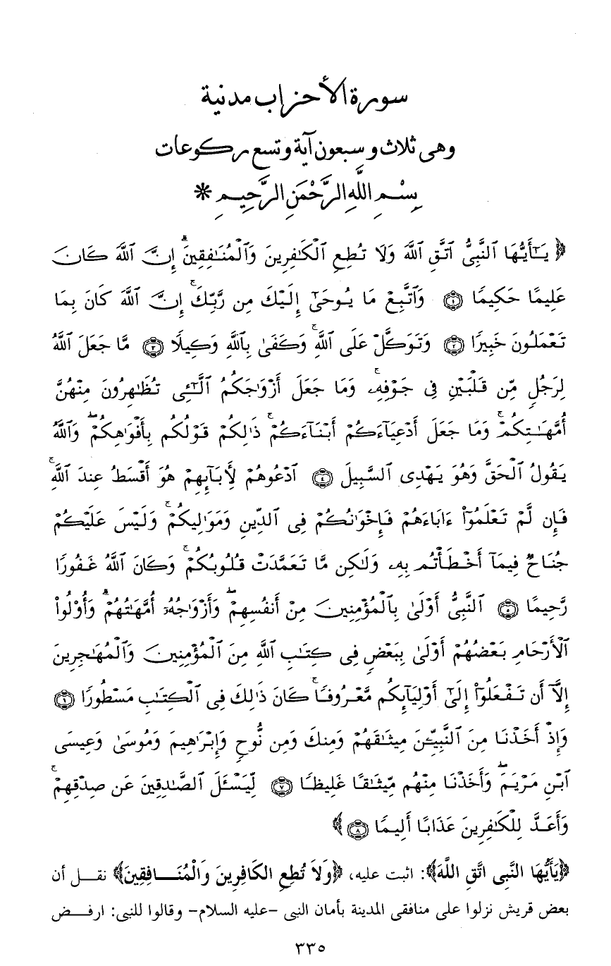 (يَا أَيُّهَا النَّبِيُّ اتَّقِ اللهَ وَلَا تُطِعِ الْكَافِرِينَ وَالْمُنَافِقِينَ إِنَّ اللهَ كَانَ عَلِيمًا حَكِيمًا (1) وَاتَّبِعْ مَا يُوحَى إِلَيْكَ مِنْ رَبِّكَ إِنَّ اللهَ كَانَ بِمَا تَعْمَلُونَ خَبِيرًا (2) وَتَوَكَّلْ عَلَى اللهِ وَكَفَى بِاللهِ وَكِيلًا (3) مَا جَعَلَ اللهُ لِرَجُلٍ مِنْ قَلْبَيْنِ فِي جَوْفِهِ وَمَا جَعَلَ أَزْوَاجَكُمُ اللَّائِي تُظَاهِرُونَ مِنْهُنَّ أُمَّهَاتِكُمْ وَمَا جَعَلَ أَدْعِيَاءَكُمْ أَبْنَاءَكُمْ ذَلِكُمْ قَوْلُكُمْ بِأَفْوَاهِكُمْ وَاللهُ يَقُولُ الْحَقَّ وَهُوَ يَهْدِي السَّبِيلَ (4) ادْعُوهُمْ لِآبَائِهِمْ هُوَ أَقْسَطُ عِنْدَ اللهِ فَإِنْ لَمْ تَعْلَمُوا آبَاءَهُمْ فَإِخْوَانُكُمْ فِي الدِّينِ وَمَوَالِيكُمْ وَلَيْسَ عَلَيْكُمْ جُنَاحٌ فِيمَا أَخْطَأْتُمْ بِهِ وَلَكِنْ مَا تَعَمَّدَتْ قُلُوبُكُمْ وَكَانَ اللهُ غَفُورًا رَحِيمًا (5) النَّبِيُّ أَوْلَى بِالْمُؤْمِنِينَ مِنْ أَنْفُسِهِمْ وَأَزْوَاجُهُ أُمَّهَاتُهُمْ وَأُولُو الْأَرْحَامِ بَعْضُهُمْ أَوْلَى بِبَعْضٍ فِي كِتَابِ اللهِ مِنَ الْمُؤْمِنِينَ وَالْمُهَاجِرِينَ إِلَّا أَنْ تَفْعَلُوا إِلَى أَوْلِيَائِكُمْ مَعْرُوفًا كَانَ ذَلِكَ فِي الْكِتَابِ مَسْطُورًا (6) وَإِذْ أَخَذْنَا مِنَ النَّبِيِّينَ مِيثَاقَهُمْ وَمِنْكَ وَمِنْ نُوحٍ وَإِبْرَاهِيمَ وَمُوسَى وَعِيسَى ابْنِ مَرْيَمَ وَأَخَذْنَا مِنْهُمْ مِيثَاقًا غَلِيظًا (7) لِيَسْأَلَ الصَّادِقِينَ عَنْ صِدْقِهِمْ وَأَعَدَّ لِلْكَافِرِينَ عَذَابًا أَلِيمًا (8)