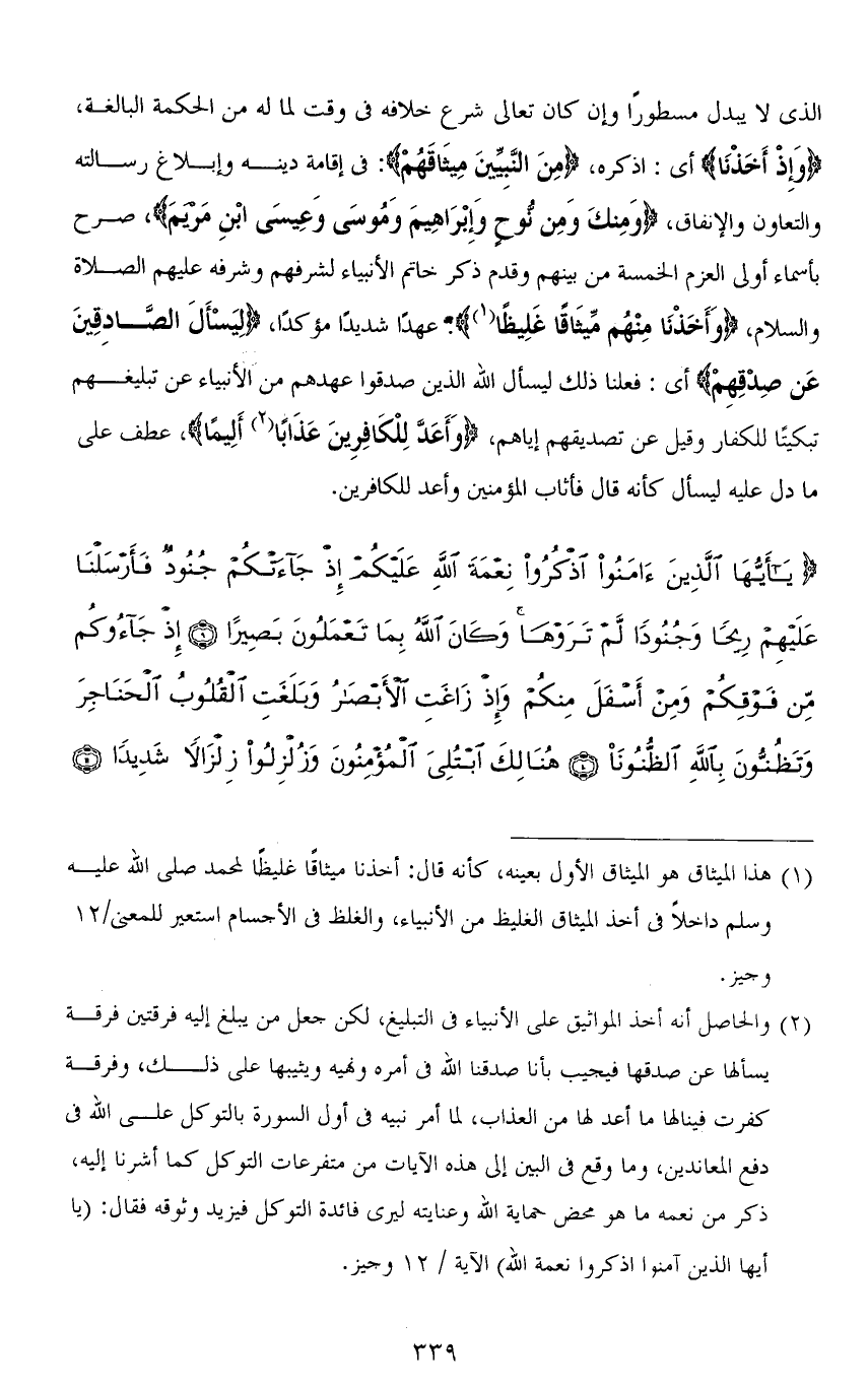 الذي لا يبدل مَسْطُورًا وإن كان تعالى شرع خلافه في وقت لما له من الحكمة البالغة، (وَإِذْ أَخَذْنَا) أي: اذكره، (مِنَ النَّبِيِّينَ مِيثَاقَهُمْ): في إقامة دينه وإبلاغ رسالته والتعاون والإنفاق، (وَمِنْكَ وَمِنْ نُوحٍ وَإِبْرَاهِيمَ وَمُوسَى وَعِيسَى ابْنِ مَرْيَمَ)، صرح بأسماء أولي العزم الخمسة من بينهم وقدم ذكر خاتم الأنبياء لشرفهم وشرفه عليهم الصلاة والسلام، (وَأَخَذْنَا مِنْهُمْ مِيثَاقًا غَلِيظًا)، عهدًا شديدًا مؤكدًا، (لِيَسْأَلَ الصَّادِقِينَ عَنْ صِدْقِهِمْ) أي: فعلنا ذلك ليسأل الله الذين صدقوا عهدهم من الأنبياء عن تبليغهم تبكيتًا للكفار وقيل عن تصديقهم إياهم، (وَأَعَدَّ لِلْكَافِرِينَ عَذَابًا أَلِيمًا)، عطف على ما دل عليه ليسأل كأنه قال فأثاب المؤمنين وأعد للكافرين.