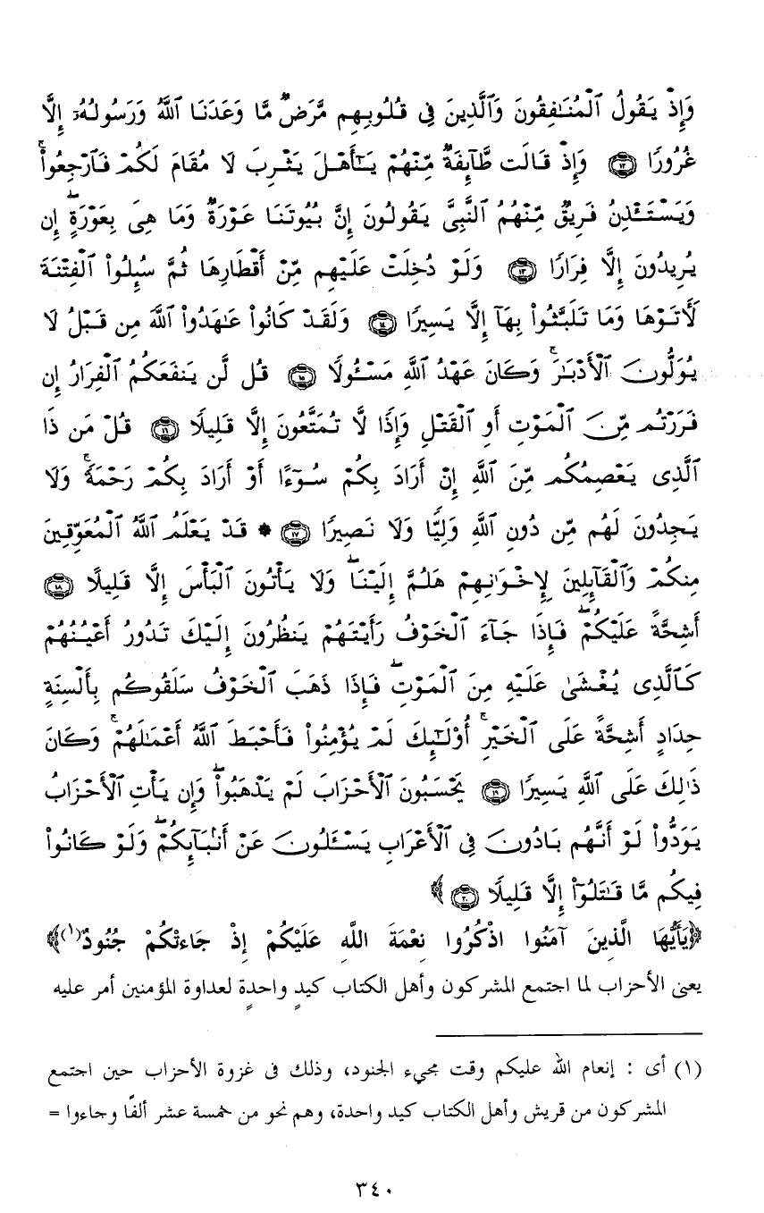 وَإِذْ يَقُولُ الْمُنَافِقُونَ وَالَّذِينَ فِي قُلُوبِهِمْ مَرَضٌ مَا وَعَدَنَا اللهُ وَرَسُولُهُ إِلَّا غُرُورًا (12) وَإِذْ قَالَتْ طَائِفَةٌ مِنْهُمْ يَا أَهْلَ يَثْرِبَ لَا مُقَامَ لَكُمْ فَارْجِعُوا وَيَسْتَأْذِنُ فَرِيقٌ مِنْهُمُ النَّبِيَّ يَقُولُونَ إِنَّ بُيُوتَنَا عَوْرَةٌ وَمَا هِيَ بِعَوْرَةٍ إِنْ يُرِيدُونَ إِلَّا فِرَارًا (13) وَلَوْ دُخِلَتْ عَلَيْهِمْ مِنْ أَقْطَارِهَا ثُمَّ سُئِلُوا الْفِتْنَةَ لَآتَوْهَا وَمَا تَلَبَّثُوا بِهَا إِلَّا يَسِيرًا (14) وَلَقَدْ كَانُوا عَاهَدُوا اللهَ مِنْ قَبْلُ لَا يُوَلُّونَ الْأَدْبَارَ وَكَانَ عَهْدُ اللهِ مَسْئُولًا (15) قُلْ لَنْ يَنْفَعَكُمُ الْفِرَارُ إِنْ فَرَرْتُمْ مِنَ الْمَوْتِ أَوِ الْقَتْلِ وَإِذًا لَا تُمَتَّعُونَ إِلَّا قَلِيلًا (16) قُلْ مَنْ ذَا الَّذِي يَعْصِمُكُمْ مِنَ اللهِ إِنْ أَرَادَ بِكُمْ سُوءًا أَوْ أَرَادَ بِكُمْ رَحْمَةً وَلَا يَجِدُونَ لَهُمْ مِنْ دُونِ اللهِ وَلِيًّا وَلَا نَصِيرًا (17) قَدْ يَعْلَمُ اللهُ الْمُعَوِّقِينَ مِنْكُمْ وَالْقَائِلِينَ لِإِخْوَانِهِمْ هَلُمَّ إِلَيْنَا وَلَا يَأْتُونَ الْبَأْسَ إِلَّا قَلِيلًا (18) أَشِحَّةً عَلَيْكُمْ فَإِذَا جَاءَ الْخَوْفُ رَأَيْتَهُمْ يَنْظُرُونَ إِلَيْكَ تَدُورُ أَعْيُنُهُمْ كَالَّذِي يُغْشَى عَلَيْهِ مِنَ الْمَوْتِ فَإِذَا ذَهَبَ الْخَوْفُ سَلَقُوكُمْ بِأَلْسِنَةٍ حِدَادٍ أَشِحَّةً عَلَى الْخَيْرِ أُولَئِكَ لَمْ يُؤْمِنُوا فَأَحْبَطَ اللهُ أَعْمَالَهُمْ وَكَانَ ذَلِكَ عَلَى اللهِ يَسِيرًا (19) يَحْسَبُونَ الْأَحْزَابَ لَمْ يَذْهَبُوا وَإِنْ يَأْتِ الْأَحْزَابُ يَوَدُّوا لَوْ أَنَّهُمْ بَادُونَ فِي الْأَعْرَابِ يَسْأَلُونَ عَنْ أَنْبَائِكُمْ وَلَوْ كَانُوا فِيكُمْ مَا قَاتَلُوا إِلَّا قَلِيلًا (20)