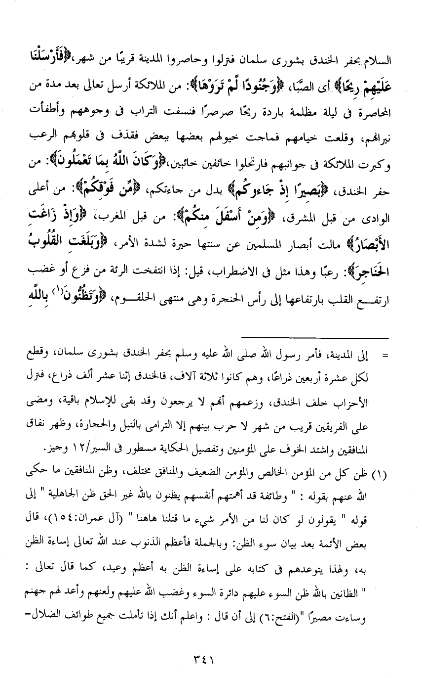 السلام بحفر الخندق بشورى سلمان فنزلوا وحاصووا المدينة قريبًا من شهر، (فَأَرْسَلْنَا عَلَيْهِمْ رِيحًا) أي الصَّبَا، (وَجُنُودًا لَمْ تَرَوْهَا): من الملائكة أرسل تعالى بعد مدة من المحاصرة في ليلة مظلمة باردة ريحًا صرصرًا فنسفت التراب في وجوههم وأطفأت نيرانهم، وقلعت خيامهم فماجت خيولهم بعضها ببعض فقذف في قلوبهم الرعب وكبرت الملائكة في جوانبهم فارتحلوا خائفين خائبين، (وَكَانَ اللهُ بِمَا تَعْمَلُونَ): من حفر الخندق، (بَصِيرًا إِذْ جَاءوكم) بدل من جاءتكم، (مِّن فوْقِكُمْ): من أعلى الوادي من قبل المشرق، (وَمِنْ أَسْفَلَ مِنْكُمْ): من قبل المغرب، (وَإِذْ زَاغَتِ الْأَبْصَارُ) مالت أبصار المسلمين عن سنتها حيرة لشدة الأمر، (وَبَلَغَتِ الْقُلُوبُ الْحَنَاجِرَ): رعبًا وهذا مثل في الاضطراب، قيل: إذا انتفخت الرئة من فزع أو غضب ارتفع القلب بارتفاعها إلى رأس الحنجرة وهي منتهى الحلقوم، (وَتَظُنُّونَ بِاللهِ