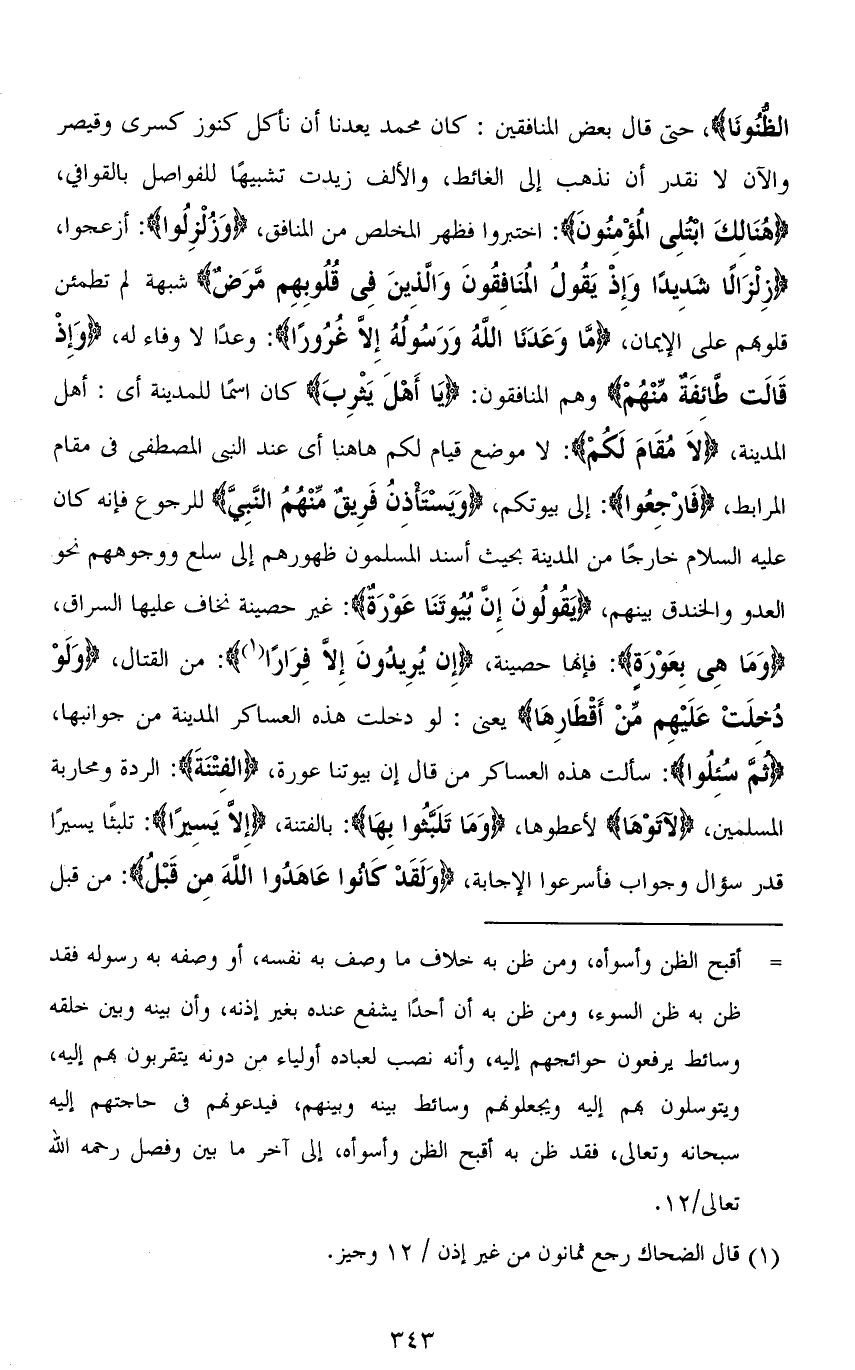 الظُّنُونَا)، حتى قال بعض المنافقين: كان محمد يعدنا أن نأكل كنوز كسرى وقيصر والآن لا نقدر أن نذهب إلى الغائط، والألف زيدت تشبيهًا للفواصل بالقوافي، (هُنَالِكَ ابْتُلِيَ الْمُؤْمِنُونَ): اختبروا فظهر المخلص من المنافق، (وَزُلْزِلُوا): أزعجوا، (زِلْزَالًا شَدِيدً وَإِذْ يَقُولُ الْمُنَافِقُونَ وَالَّذِينَ فِي قُلُوبِهِمْ مَرَضٌ) شبهة لم تطمئن قلوبهم على الإيمان، (مَا وَعَدَنَا اللهُ وَرَسُولُهُ إِلَّا غُرُورًا): وعدًا لا وفاء له، (وَإِذْ قَالَتْ طَائِفَةٌ مِنْهُمْ) وهم المنافقون: (يَا أَهْلَ يَثْرِبَ) كان اسمًا للمدينة أي: أهل المدينة، (لاَ مُقَامَ لَكُمْ): لا موضع قيام لكم هاهنا أي عند النبي المصطفى في مقام المرابط، (فارْجِعُوا): إلى بيوتكم، (وَيَسْتَأْذِنُ فَرِيقٌ مِنْهُمُ النَّبِيَّ) للرجوع فإنه كان عليه السلام خارجًا من المدينة بحيث أسند المسلمون ظهورهم إلى سلع ووجوههم نحو العدو والخندق بينهم، (يَقُولُونَ إِنَّ بُيُوتَنَا عَوْرَةٌ): غير حصينة نخاف عليها السراق، (وَمَا هِيَ بِعَوْرَةٍ): فإنها حصينة، (إِنْ يُرِيدُونَ إِلَّا فِرَارًا): من القتال، (وَلَوْ دُخِلَتْ عَلَيْهِمْ مِنْ أَقْطَارِهَا) يعني: لو دخلت هذه العساكر المدينة من جوانبها، (ثُمَّ سُئِلُوا): سألت هذه العساكر من قال إن بيوتنا عورة، (الفِتْنَةَ): الردة ومحاربة المسلمين، (لَآتَوْهَا) لأعطوها، (وَمَا تَلَبَّثُوا بِهَا): بالفتنة، (إِلَّا يَسِيرًا): تلبثًا يسيرًا قدر سؤال وجواب فأسرعوا الإجابة، (وَلَقَدْ كَانُوا عَاهَدُوا اللهَ مِنْ قَبْلُ): من قبل