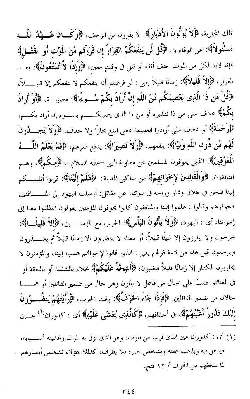 تلك المحاربة، (لَا يُوَلُّونَ الْأَدْبَارَ): لا يفرون من الزحف، (وَكَانَ عَهْدُ اللهِ مَسْئُولًا): عن الوفاء به، (قُل لن يَنفَعَكُمُ الفِرَارُ إِن فَرَرْتُم مِّنَ المَوْتِ أَوِ القَتْلِ) فإنه لابد لكل من الموت حتف أنفه أو قتل في وقتٍ معينٍ، (وَإِذًا لَا تُمَتَّعُونَ): بعد الفرار، (إِلَّا قَلِيلاً): زمانًا قليلاً يعني: لو فرضتم أنه ينفعكم لا ينفعكم إلا قليلاً، (قُلْ مَنْ ذَا الَّذِي يَعْصِمُكُمْ مِنَ اللهِ إِنْ أَرَادَ بِكُمْ سُوءًا): مصيبة، (أَوْ أَرَأدَ بكُمْ) عطف على من ذا تقديره أو من ذا الذي يصيبكم بسوء إن أراد بكم، (رَحْمَةً) أو عطف على أرادوا العصمة بمعنى المنع مجازًا ولا حذف، (وَلَا يَجِدُونَ لَهُمْ مِنْ دُونِ اللهِ وَلِيًّا): ينفعهم، (وَلَا نَصِيرًا): يدفع ضرهم، (قَدْ يَعْلَمُ اللهُ الْمُعَوِّقِينَ): الذين يعوقون المسلمين عن معاونة النبي - عليه السلام -، (مِنكُمْ)، وهم المنافقون، (وَالْقَائِلِينَ لِإِخْوَانِهِمْ) من ساكني المدينة: (هَلُمَّ إِلَيْنَا): قربوا أنفسكم إلينا فنحن في ظلال وثمار وراحة في بيوتنا، عن مقاتل: أرسلت اليهود إلى المنافقين فخوفوهم وقالوا: هلموا إلينا والمنافقون كانوا يخوفون المؤمنين يقولون انطلقوا معنا إلى إخواننا، أي: اليهود، (وَلَا يَأْتُونَ الْبَأْسَ): الحرب مع المؤمنين، (إِلَّا قَلِيلًا): يخرجون ولا يبارزون إلا شيئًا قليلاً، أو معناه لا يحضرون إلا زمانًا قليلاً ثم يعتذرون ويرجعون قيل هذا من تتمة قولهم يعني؛ الذين قالوا لإخوانهم هلموا إلينا، والمؤمنون لا يحاربون الكفار إلا زمانًا قليلاً فيغلبون، (أَشِحَّةً عَلَيْكُمْ) بخلاء بالشفقة أو بالنفقة أو فى الغنائم نصب على الحال من فاعل لا يأتون وهو حال من ضمير القائلين أو هما حالان من ضمير القائلين، (فَإِذَا جَاءَ الْخَوْفُ): وقت الحرب، (رَأَيْتَهُمْ يَنْظُرُونَ إِلَيْكَ تَدُورُ أَعْيُنُهُمْ)، في أحداقهم، (كَالَّذِي يُغْشَى عَلَيْهِ) أي: كدوران عين