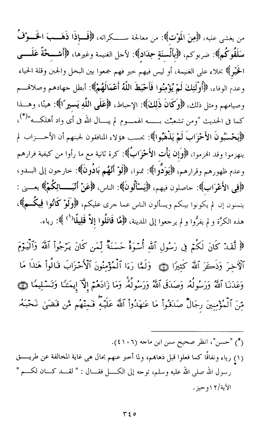 من يغشى عليه، (مِنَ الْمَوْتِ): من معالجة سكراته، (فَإِذَا ذَهَبَ الْخَوْفُ سَلَقُوكُمْ): ضربوكم، (بِأَلْسِنَةٍ حِدَادٍ): لأجل الغنيمة وغيرها، (أَشِحَّةً عَلَى الخَيْرِ) بخلاء على الغنيمة، أو ليس فيهم خير فهم جمعوا بين البخل والجبن وقلة الحياء وعدتم الوفاء، (أُوْلَئِكَ لَمْ يُؤْمِنُوا فَأَحْبَطَ اللهُ أَعْمَالَهُمْ): أبطل جهادهم وصلاتهم وصيامهم ومثل ذلك، (وَكَانَ ذَلِكَ): الإحباط، (عَلَى اللهِ يَسِيرًا): هينًا، وهذا كما في الحديث " ومن تشعبت به الهموم لم يبال الله في أي واد أهلكه "، (يَحْسَبُونَ الْأَحْزَابَ لَمْ يَذْهَبُوا): يحسب هؤلاء المنافقون لجبنهم أن الأحزاب لم ينهزموا وقد انهزموا، (وَإِنْ يَأْتِ الْأَحْزَابُ): كرة ثانية مع ما رأوا من كيفية فرارهم وعدم ظهورهم وقرارهم، (يَوَدُّوا): تمنوا، (لَوْ أَنَّهُمْ بَادُونَ): خارجون إلى البدو، (فِي الْأَعْرَابِ): حاصلون فيهم، (يَسْأَلُونَ): الناس، (عَنْ أَنْبَائِكُمْ) يعني: يتمنون أن لم يكونوا بينكم ويسألون الناس عما جرى عليكم، (وَلَوْ كَانُوا فِيكُمْ)، هذه الكرَّة ولم يفرُّوا ولم يرجعوا إلى المدينة، (مَا قَاتَلُوا إِلَّا قَلِيلًا): رياء.