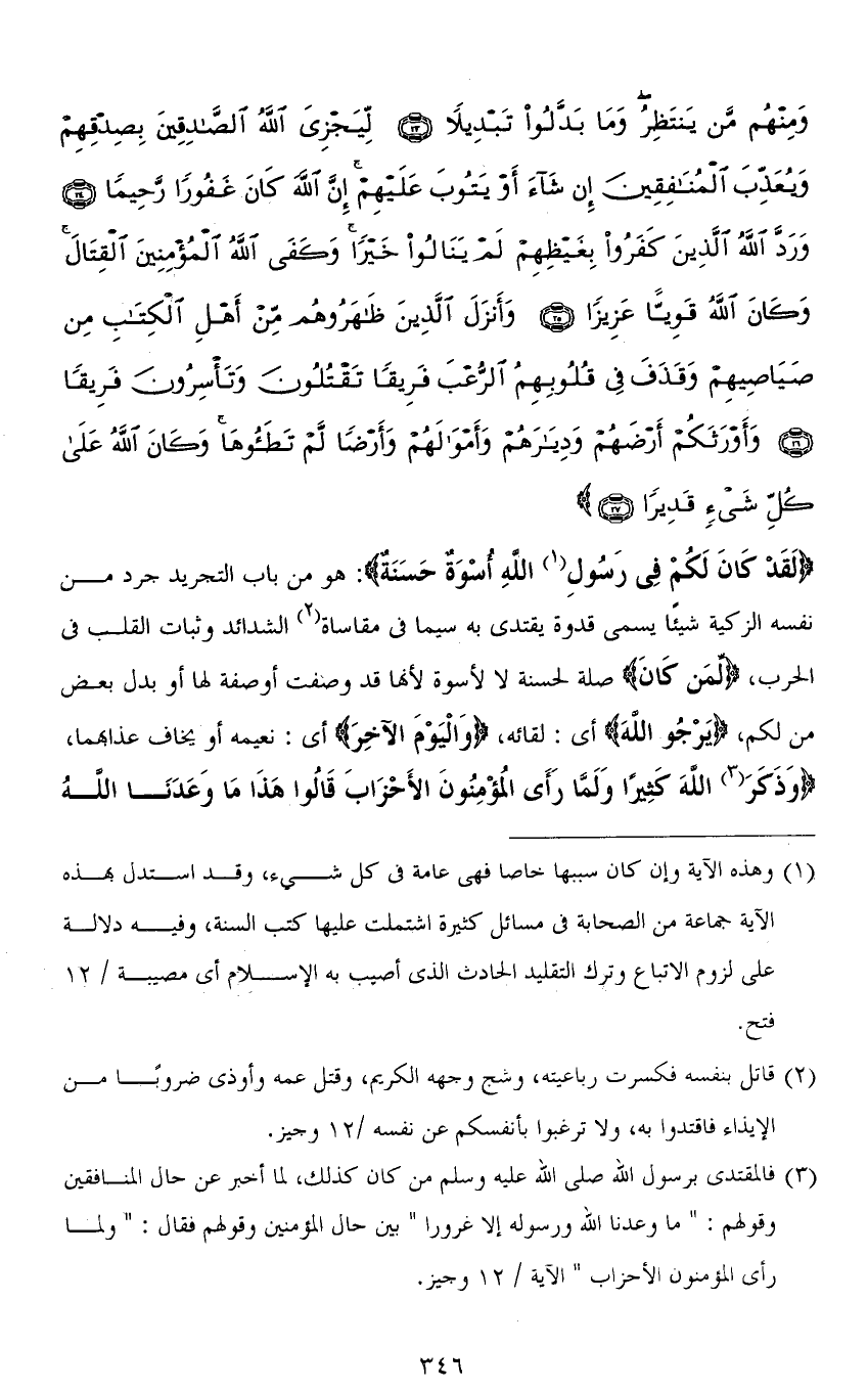 (لَقَدْ كَانَ لَكُمْ فِي رَسُولِ اللهِ أُسْوَةٌ حَسَنَةٌ): هو من باب التجريد جرد من نفسه الزكية شيئًا يسمى قدوة يقتدى به سيما في مقاساة الشدائد وثبات القلب في الحرب، (لمَن كَان) صلة لحسنة لا لأسوة لأنها قد وصفت أوصفة لها أو بدل بعض من لكم، (يَرْجُو اللهَ) أي: لقائه، (وَالْيَوْمَ الْآخِرَ) أي: نعيمه أو يخاف عذابهما، (وَذَكَرَ اللهَ كَثِيرًا وَلَمَّا رَأَى الْمُؤْمِنُونَ الْأَحْزَابَ قَالُوا هَذَا مَا وَعَدَنَا اللهُ