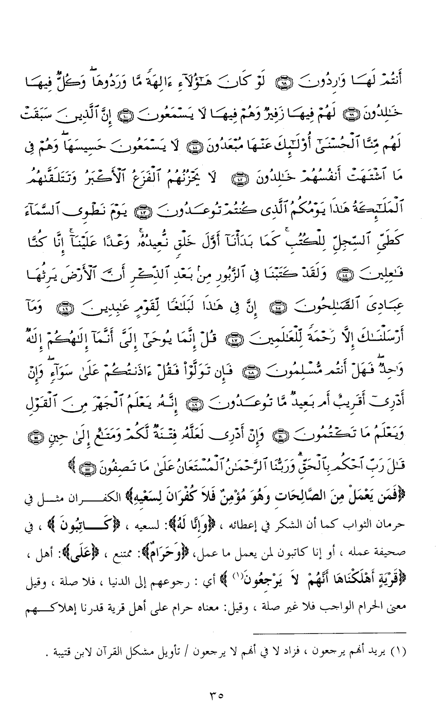 أَنْتُمْ لَهَا وَارِدُونَ (98) لَوْ كَانَ هَؤُلَاءِ آلِهَةً مَا وَرَدُوهَا وَكُلٌّ فِيهَا خَالِدُونَ (99) لَهُمْ فِيهَا زَفِيرٌ وَهُمْ فِيهَا لَا يَسْمَعُونَ (100) إِنَّ الَّذِينَ سَبَقَتْ لَهُمْ مِنَّا الْحُسْنَى أُولَئِكَ عَنْهَا مُبْعَدُونَ (101) لَا يَسْمَعُونَ حَسِيسَهَا وَهُمْ فِي مَا اشْتَهَتْ أَنْفُسُهُمْ خَالِدُونَ (102) لَا يَحْزُنُهُمُ الْفَزَعُ الْأَكْبَرُ وَتَتَلَقَّاهُمُ الْمَلَائِكَةُ هَذَا يَوْمُكُمُ الَّذِي كُنْتُمْ تُوعَدُونَ (103) يَوْمَ نَطْوِي السَّمَاءَ كَطَيِّ السِّجِلِّ لِلْكُتُبِ كَمَا بَدَأْنَا أَوَّلَ خَلْقٍ نُعِيدُهُ وَعْدًا عَلَيْنَا إِنَّا كُنَّا فَاعِلِينَ (104) وَلَقَدْ كَتَبْنَا فِي الزَّبُورِ مِنْ بَعْدِ الذِّكْرِ أَنَّ الْأَرْضَ يَرِثُهَا عِبَادِيَ الصَّالِحُونَ (105) إِنَّ فِي هَذَا لَبَلَاغًا لِقَوْمٍ عَابِدِينَ (106) وَمَا أَرْسَلْنَاكَ إِلَّا رَحْمَةً لِلْعَالَمِينَ (107) قُلْ إِنَّمَا يُوحَى إِلَيَّ أَنَّمَا إِلَهُكُمْ إِلَهٌ وَاحِدٌ فَهَلْ أَنْتُمْ مُسْلِمُونَ (108) فَإِنْ تَوَلَّوْا فَقُلْ آذَنْتُكُمْ عَلَى سَوَاءٍ وَإِنْ أَدْرِي أَقَرِيبٌ أَمْ بَعِيدٌ مَا تُوعَدُونَ (109) إِنَّهُ يَعْلَمُ الْجَهْرَ مِنَ الْقَوْلِ وَيَعْلَمُ مَا تَكْتُمُونَ (110) وَإِنْ أَدْرِي لَعَلَّهُ فِتْنَةٌ لَكُمْ وَمَتَاعٌ إِلَى حِينٍ (111) قَالَ رَبِّ احْكُمْ بِالْحَقِّ وَرَبُّنَا الرَّحْمَنُ الْمُسْتَعَانُ عَلَى مَا تَصِفُونَ (112)