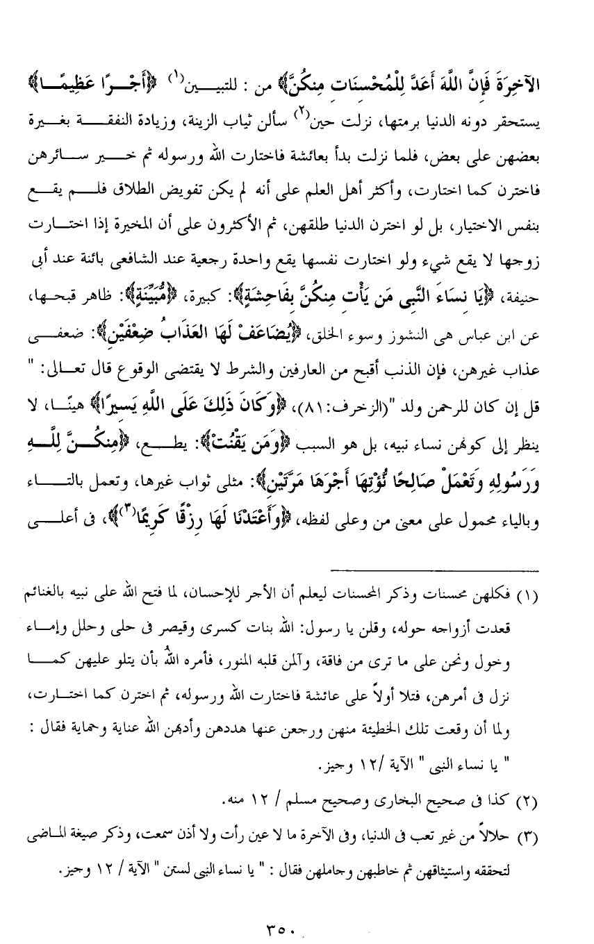 الْآخِرَةَ فَإِنَّ اللهَ أَعَدَّ لِلْمُحْسِنَاتِ مِنْكُنَّ) من: للتبيين (أَجْرًا عَظِيمًا) يستحقر دونه الدنيا برمتها، نزلت حين سألن ثياب الزينة، وزيادة النفقة بغيرة بعضهن على بعض، فلما نزلت بدأ بعائشة فاختارت الله ورسوله ثم خير سائرهن فاخترن كما اختارت، وأكثر أهل العلم على أنه لم يكن تفويض الطلاق فلم يقع بنفس الاختيار، بل لو اخترن الدنيا طلقهن، ثم الأكثرون على أن المخيرة إذا اختارت زوجها لا يقع شيء ولو اختارت نفسها يقع واحدة رجعية عند الشافعي بائنة عند أبي حنيفة، (يَا نِسَاءَ النَّبِيِّ مَنْ يَأْتِ مِنْكُنَّ بِفَاحِشَةٍ): كبيرة، (مُبَيِّنَةٍ): ظاهر قبحها، عن ابن عباس هي النشوز وسوء الخلق، (يُضَاعَفْ لَهَا الْعَذَابُ ضِعْفَيْنِ): ضعفي عذاب غيرهن، فإن الذنب أقبح من العارفين والشرط لا يقتضي الوقوع قال تعالى: " قل إن كان للرحمن ولد " [الزخرف: 81]، (وَكَانَ ذَلِكَ عَلَى اللهِ يَسِيرًا) هينًا، لا ينظر إلى كونهن نساء نبيه، بل هو السبب (وَمَن يَقْنُتْ): يطع، (مِنْكُنَّ لله وَرَسُولِهِ وَتَعْمَلْ صَالِحًا نُؤْتِهَا أَجْرَهَا مَرَّتَيْنِ): مثلي ثواب غيرها، وتعمل بالتاء وبالياء محمول على معنى من وعلى لفظه، (وَأَعْتَدْنَا لَهَا رِزْقًا كَرِيمًا)، في أعلى