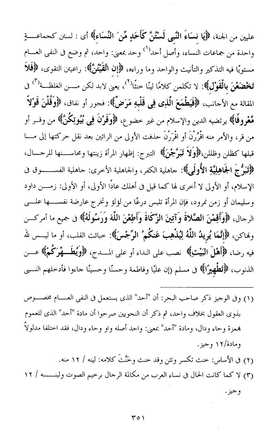 عليين من الجنة، (يَا نِسَاءَ النَّبِيِّ لَسْتُنَّ كَأَحَدٍ مِنَ النِّسَاءِ) أي: لستن كجماعةٍ واحدة من جماعات النساء، وأصل أحد وحد بمعنى: واحد، ثم وضع في النفي العام مستويًا فيه التذكير والتأنيث والواحد وما وراءه، (إِنِ اتَّقَيْتُنَّ): راعيتنَّ التقوى، (فَلَا تَخْضَعْنَ بِالْقَوْلِ): لا تكلمن كلامًا لينًا خنثًا، يعني لابد لكن من الغلظة في المقالة مع الأجانب، (فَيَطْمَعَ الَّذِي فِي قَلْبِهِ مَرَضٌ): فجور أو نفاق، (وَقُلْنَ قَوْلًا مَعْرُوفًا) يرتضيه الدين والإسلام من غير خضوع، (وَقَرْنَ فِي بُيُوتِكُنَّ) من وقر أو من قرَّ، والأمر منه اقْرُرْنَ أو اقْرَرْنَ حذفت الأولى من الرائين بعد نقل حركتها إلى ما قبلها كظلن وظللن، (وَلاَ تَبَرَّجْنَ) التبرج: إظهار المرأة زينتها ومحاسنها للرجال، (تَبَرُّجَ الْجَاهِلِيَّةِ الْأُولَى): جاهلية الكفر، والجاهلية الأخرى: جاهلية الفسوق في الإسلام، أو الأولى لا أخرى لها كما قيل في أهلك عادًا الأولى، أو الأولى: زمن داود وسليمان أو زمن نمرود، فإن المرأة تلبس درعًا من لؤلؤ وتخرج عارضة نفسها على الرجال، (وَأَقِمْنَ الصَّلاةَ وَآتِينَ الزَّكَاةَ وَأَطِعْنَ الله وَرَسُولَهُ) في جميع ما أمركن ونهاكن، (إِنَّمَا يُرِيدُ اللهُ لِيُذْهِبَ عَنكُمُ الرِّجْسَ): خبائث القلب، أو ما ليس لله فيه رضا، (أَهْلَ البَيْتِ) نصب على النداء أو على المدح، (وَيُطَهِّرَكُمْ) عن الذنوب، (تَطْهِيرًا) في مسلم (إن عليًا وفاطمة وحسنًا وحسينًا جاءوا فأدخلهم النبي - صلى الله عليه وسلم -