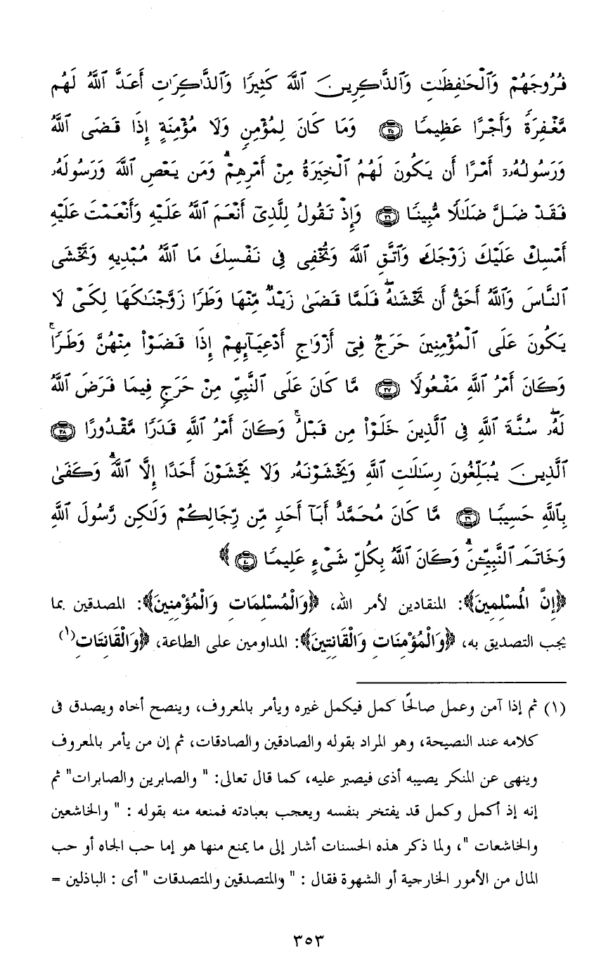 فُرُوجَهُمْ وَالْحَافِظَاتِ وَالذَّاكِرِينَ اللهَ كَثِيرًا وَالذَّاكِرَاتِ أَعَدَّ اللهُ لَهُمْ مَغْفِرَةً وَأَجْرًا عَظِيمًا (35) وَمَا كَانَ لِمُؤْمِنٍ وَلَا مُؤْمِنَةٍ إِذَا قَضَى اللهُ وَرَسُولُهُ أَمْرًا أَنْ يَكُونَ لَهُمُ الْخِيَرَةُ مِنْ أَمْرِهِمْ وَمَنْ يَعْصِ اللهَ وَرَسُولَهُ فَقَدْ ضَلَّ ضَلَالًا مُبِينًا (36) وَإِذْ تَقُولُ لِلَّذِي أَنْعَمَ اللهُ عَلَيْهِ وَأَنْعَمْتَ عَلَيْهِ أَمْسِكْ عَلَيْكَ زَوْجَكَ وَاتَّقِ اللهَ وَتُخْفِي فِي نَفْسِكَ مَا اللهُ مُبْدِيهِ وَتَخْشَى النَّاسَ وَاللهُ أَحَقُّ أَنْ تَخْشَاهُ فَلَمَّا قَضَى زَيْدٌ مِنْهَا وَطَرًا زَوَّجْنَاكَهَا لِكَيْ لَا يَكُونَ عَلَى الْمُؤْمِنِينَ حَرَجٌ فِي أَزْوَاجِ أَدْعِيَائِهِمْ إِذَا قَضَوْا مِنْهُنَّ وَطَرًا وَكَانَ أَمْرُ اللهِ مَفْعُولًا (37) مَا كَانَ عَلَى النَّبِيِّ مِنْ حَرَجٍ فِيمَا فَرَضَ اللهُ لَهُ سُنَّةَ اللهِ فِي الَّذِينَ خَلَوْا مِنْ قَبْلُ وَكَانَ أَمْرُ اللهِ قَدَرًا مَقْدُورًا (38) الَّذِينَ يُبَلِّغُونَ رِسَالَاتِ اللهِ وَيَخْشَوْنَهُ وَلَا يَخْشَوْنَ أَحَدًا إِلَّا اللهَ وَكَفَى بِاللهِ حَسِيبًا (39) مَا كَانَ مُحَمَّدٌ أَبَا أَحَدٍ مِنْ رِجَالِكُمْ وَلَكِنْ رَسُولَ اللهِ وَخَاتَمَ النَّبِيِّينَ وَكَانَ اللهُ بِكُلِّ شَيْءٍ عَلِيمًا (40)