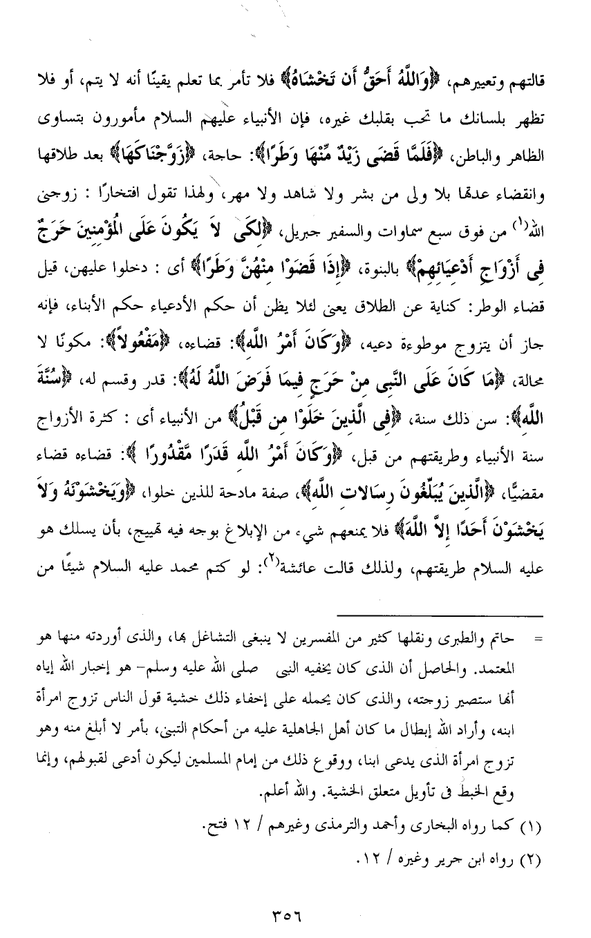 قالتهم وتعييرهم، (وَاللهُ أَحَقُّ أَنْ تَخْشَاهُ) فلا تأمر بما تعلم يقينًا أنه لا يتم، أو فلا تظهر بلسانك ما تحب بقلبك غيره، فإن الأنبياء عليهم السلام مأمورون بتساوي الظاهر والباطن، (فَلَمَّا قَضَى زَيْدٌ منْهَا وَطَرًا): حاجة، (زَوجْنَاكَهَا) بعد طلاقها وانقضاء عدتها بلا ولي من بشر ولا شاهد ولا مهر، ولهذا تقول افتخارًا: زوجني الله من فوق سبع سماوات والسفير جبريل، (لِكَي لَا يَكُونَ عَلَى المُؤْمِنِينَ حَرَجٌ فِى أَزْوَاج أَدْعِيَائِهِمْ) بالبنوة، (إِذَا قَضَوْا مِنْهُن وَطَرًا) أي: دخلوا عليهن، قيل قضاء الوطر: كناية عن الطلاق يعني لئلا يظن أن حكم الأدعياء حكم الأبناء، فإنه جاز أن يتزوج موطوءة دعيه، (وَكَان أَمْرُ اللهِ): قضاءه، (مَفْعُولًا): مكونًا لا محالة، (مَا كَانَ عَلَى النَّبِيِّ مِنْ حَرَج فِيمَا فَرَضَ اللهُ لَهُ): قدر وقسم له، (سُنَّةَ اللهِ): سن ذلك سنة، (فِى الذينَ خَلَوْا مِن قَبْلُ) من الأنبياء أي: كثرة الأزواج سنة الأنبياء وطريقتهم من قبل، (وَكَان أَمْرُ اللهِ قَدَرًا مَّقْدُورًا): قضاءه قضاء مقضيًّا، (الَّذِينَ يُبَلِّغُونَ رِسَالَاتِ اللهِ)، صفة مادحة للذين خلوا، (وَيَخْشَوْنَهُ وَلَا يَخْشَوْنَ أَحَدًا إِلَّا اللهَ) فلا يمنعهم شيء من الإبلاغ بوجه فيه تهييج، بأن يسلك هو عليه السلام طريقتهم، ولذلك قالت عائشة: لو كتم محمد عليه السلام شيئًا من