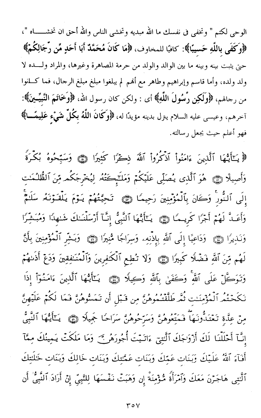 (يَا أَيُّهَا الَّذِينَ آمَنُوا اذْكُرُوا اللهَ ذِكْرًا كَثِيرًا (41) وَسَبِّحُوهُ بُكْرَةً وَأَصِيلًا (42) هُوَ الَّذِي يُصَلِّي عَلَيْكُمْ وَمَلَائِكَتُهُ لِيُخْرِجَكُمْ مِنَ الظُّلُمَاتِ إِلَى النُّورِ وَكَانَ بِالْمُؤْمِنِينَ رَحِيمًا (43) تَحِيَّتُهُمْ يَوْمَ يَلْقَوْنَهُ سَلَامٌ وَأَعَدَّ لَهُمْ أَجْرًا كَرِيمًا (44) يَا أَيُّهَا النَّبِيُّ إِنَّا أَرْسَلْنَاكَ شَاهِدًا وَمُبَشِّرًا وَنَذِيرًا (45) وَدَاعِيًا إِلَى اللهِ بِإِذْنِهِ وَسِرَاجًا مُنِيرًا (46) وَبَشِّرِ الْمُؤْمِنِينَ بِأَنَّ لَهُمْ مِنَ اللهِ فَضْلًا كَبِيرًا (47) وَلَا تُطِعِ الْكَافِرِينَ وَالْمُنَافِقِينَ وَدَعْ أَذَاهُمْ وَتَوَكَّلْ عَلَى اللهِ وَكَفَى بِاللهِ وَكِيلًا (48) يَا أَيُّهَا الَّذِينَ آمَنُوا إِذَا نَكَحْتُمُ الْمُؤْمِنَاتِ ثُمَّ طَلَّقْتُمُوهُنَّ مِنْ قَبْلِ أَنْ تَمَسُّوهُنَّ فَمَا لَكُمْ عَلَيْهِنَّ مِنْ عِدَّةٍ تَعْتَدُّونَهَا فَمَتِّعُوهُنَّ وَسَرِّحُوهُنَّ سَرَاحًا جَمِيلًا (49) يَا أَيُّهَا النَّبِيُّ إِنَّا أَحْلَلْنَا لَكَ أَزْوَاجَكَ اللَّاتِي آتَيْتَ أُجُورَهُنَّ وَمَا مَلَكَتْ يَمِينُكَ مِمَّا أَفَاءَ اللهُ عَلَيْكَ وَبَنَاتِ عَمِّكَ وَبَنَاتِ عَمَّاتِكَ وَبَنَاتِ خَالِكَ وَبَنَاتِ خَالَاتِكَ اللَّاتِي هَاجَرْنَ مَعَكَ وَامْرَأَةً مُؤْمِنَةً إِنْ وَهَبَتْ نَفْسَهَا لِلنَّبِيِّ إِنْ أَرَادَ النَّبِيُّ أَنْ