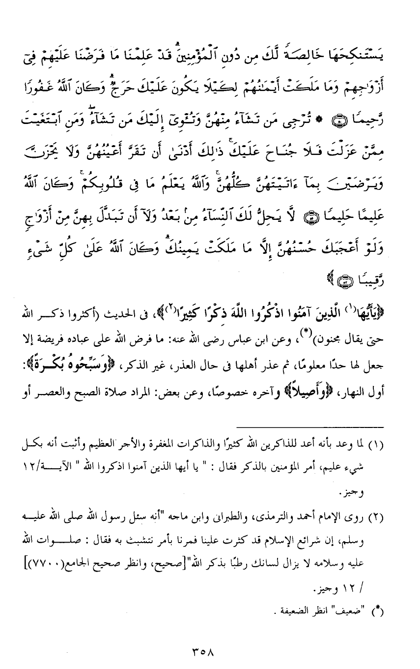 (يَا أَيُّهَا الَّذِينَ آمَنُوا اذْكُرُوا اللهَ ذِكْرًا كَثِيرًا)، في الحديث (أكثروا ذكر الله حتى يقال مجنون)، وعن ابن عباس رضى الله عنه: ما فرض الله على عباده فريضة إلا جعل لها حدًّا معلومًا، ثم عذر أهلها في حال العذر، غير الذكر، (وَسَبِّحُوهُ بُكْرَةً): أول النهار، (وَأَصِيلًا) وآخره خصوصًا، وعن بعض: المراد صلاة الصبح والعصر أو