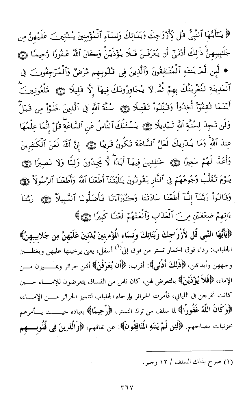 (يَا أَيُّهَا النَّبِيُّ قُلْ لِأَزْوَاجِكَ وَبَنَاتِكَ وَنِسَاءِ الْمُؤْمِنِينَ يُدْنِينَ عَلَيْهِنَّ مِنْ جَلَابِيبِهِنَّ ذَلِكَ أَدْنَى أَنْ يُعْرَفْنَ فَلَا يُؤْذَيْنَ وَكَانَ اللهُ غَفُورًا رَحِيمًا (59) لَئِنْ لَمْ يَنْتَهِ الْمُنَافِقُونَ وَالَّذِينَ فِي قُلُوبِهِمْ مَرَضٌ وَالْمُرْجِفُونَ فِي الْمَدِينَةِ لَنُغْرِيَنَّكَ بِهِمْ ثُمَّ لَا يُجَاوِرُونَكَ فِيهَا إِلَّا قَلِيلًا (60) مَلْعُونِينَ أَيْنَمَا ثُقِفُوا أُخِذُوا وَقُتِّلُوا تَقْتِيلًا (61) سُنَّةَ اللهِ فِي الَّذِينَ خَلَوْا مِنْ قَبْلُ وَلَنْ تَجِدَ لِسُنَّةِ اللهِ تَبْدِيلًا (62) يَسْأَلُكَ النَّاسُ عَنِ السَّاعَةِ قُلْ إِنَّمَا عِلْمُهَا عِنْدَ اللهِ وَمَا يُدْرِيكَ لَعَلَّ السَّاعَةَ تَكُونُ قَرِيبًا (63) إِنَّ اللهَ لَعَنَ الْكَافِرِينَ وَأَعَدَّ لَهُمْ سَعِيرًا (64) خَالِدِينَ فِيهَا أَبَدًا لَا يَجِدُونَ وَلِيًّا وَلَا نَصِيرًا (65) يَوْمَ تُقَلَّبُ وُجُوهُهُمْ فِي النَّارِ يَقُولُونَ يَا لَيْتَنَا أَطَعْنَا اللهَ وَأَطَعْنَا الرَّسُولَا (66) وَقَالُوا رَبَّنَا إِنَّا أَطَعْنَا سَادَتَنَا وَكُبَرَاءَنَا فَأَضَلُّونَا السَّبِيلَا (67) رَبَّنَا آتِهِمْ ضِعْفَيْنِ مِنَ الْعَذَابِ وَالْعَنْهُمْ لَعْنًا كَبِيرًا (68)