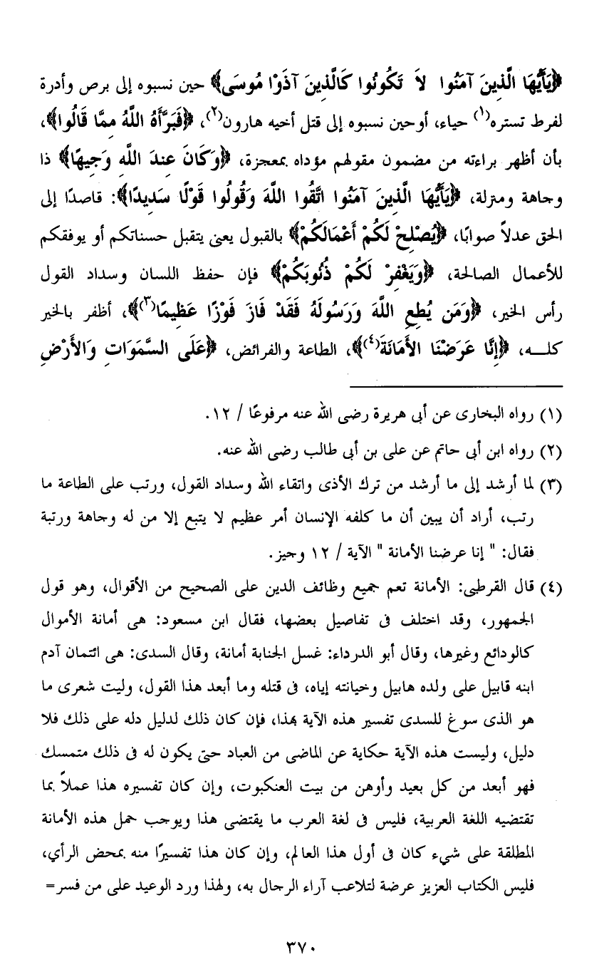 (يَا أَيُّهَا الَّذِينَ آمَنُوا لَا تَكُونُوا كَالَّذِينَ آذَوْا مُوسَى) حين نسبوه إلى برص وأدرة لفرط تستره حياء، أو حين نسبوه إلى قتل أخيه هارون، (فَبَرَّأَهُ اللهُ مِمَّا قَالُوا)، بأن أظهر براءته من مضمون مقولهم مؤداه بمعجزة، (وَكَانَ عِنْدَ اللهِ وَجِيهًا) ذا وجاهة ومنزلة، (يَا أَيُّهَا الَّذِينَ آمَنُوا اتَّقُوا اللهَ وَقُولُوا قَوْلًا سَدِيدًا): قاصدًا إلى الحق عدلاً صوابًا، (يُصْلِحْ لَكُمْ أَعْمَالَكُمْ) بالقبول يعني يتقبل حسناتكم أو يوفقكم للأعمال الصالحة، (وَيَغْفِرْ لَكُمْ ذُنُوبَكُمْ) فإن حفظ اللسان وسداد القول رأس الخير، (وَمَنْ يُطِعِ اللهَ وَرَسُولَهُ فَقَدْ فَازَ فَوْزًا عَظِيمًا)، أظفر بالخير كله، (إِنَّا عَرَضْنَا الْأَمَانَةَ)، الطاعة والفرائض، (عَلَى السَّمَاوَاتِ وَالْأَرْضِ