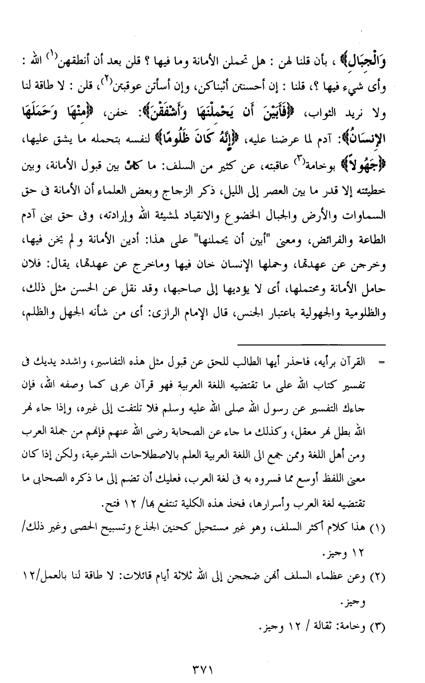 (1) كلام يفتقر إلى سند صحيح، ولا نسلم أن قوله تعالى {إِنَّهُ كَانَ ظَلُومًا جَهُولًا} يراد به آدم - عليه السلام - وكيف يصح وصفه بصيغة المبالغة في الظلم وهو نبي والجهل وقد قال الله في حقه {وَعَلَّمَ آدَمَ الْأَسْمَاءَ كُلَّهَا} والذي تطمئن إليه النفس أن - آدم - عليه السلام - وإن تحمل الأمانة فإنه قد أداها كما أمر الله تعالى ثم انتقلت الأمانة منه إلى الذرية فكان أكثرهم ظلومًا جهولاً. والله أعلم.