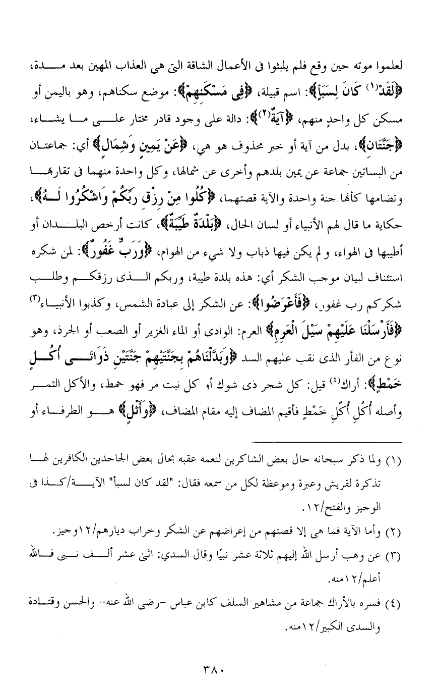 لعلموا موته حين وقع فلم يلبثوا في الأعمال الشاقة التي هي العذاب المهين بعد مدة، (لَقَدْ كَانَ لِسَبَأٍ): اسم قبيلة، (في مَسْكَنِهِمْ): موضع سكناهم، وهو باليمن أو مسكن كل واحدٍ منهم، (آيةٌ): دالة على وجود قادر مختار على ما يشاء، (جَنَّتَانِ)، بدل من آية أو خبر محذوف هو هي، (عَنْ يَمِينٍ وَشِمَالٍ) أي: جماعتان من البساتين جماعة عن يمين بلدهم وأخرى عن شمالها، وكل واحدة منهما في تقاربها وتضامها كأنها جنة واحدة والآية قصتهما، (كُلُوا مِنْ رِزْقِ رَبِّكُمْ وَاشْكُرُوا لَهُ)، حكاية ما قال لهم الأنبياء أو لسان الحال، (بَلْدَةٌ طَيِّبَةٌ)، كانت أرخص البلدان أو أطيبها في الهواء، ولم يكن فيها ذباب ولا شيء من الهوام، (وَرَبٌّ غَفُورٌ): لمن شكره استئناف لبيان موجب الشكر أي: هذه بلدة طيبة، وربكم الذي رزقكم وطلب شكركم رَبٌّ غَفُورٌ، (فَأَعْرَضُوا): عن الشكر إلى عبادة الشمس، وكذبوا الأنبياء (قَأَرْسَلْنَا عَلَيْهِمْ سَيْلَ الْعَرِمِ) العرم: الوادي أو الماء الغزبر أو الصعب أو الجُرَذ، وهو نوع من الفأر الذي نقب عليهم السد (وَبَدَّلْنَاهُمْ بِجَنَّتَيْهِمْ جَنَّتَيْنِ ذَوَاتَيْ أُكُلٍ خَمْطٍ): أراك قيل: كل شجر ذي شوك أو كل نبت مر فهو خَمْطٍ، والأكل الثمر وأصله أُكُل أُكُلٍ خَمْطٍ فأقيم المضاف إليه مقام المضاف، (وَأَثْلٍ) هو الطرفاء أو