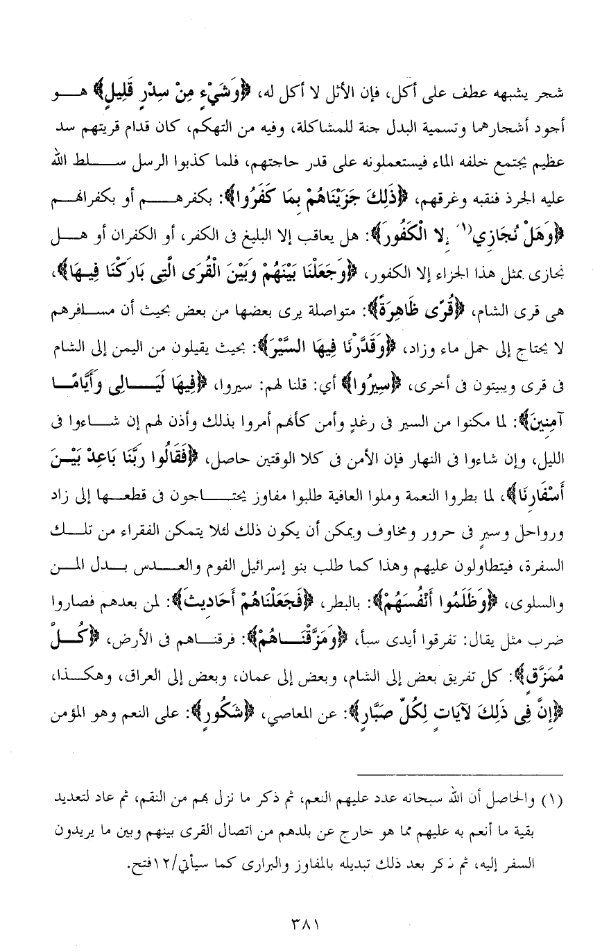 شجر يشبهه عطف على أكل، فإن الأثل لا أكل له، (وَشَيْءٍ مِنْ سِدْرٍ قَلِيلٍ) هو أجود أشجارهما وتسمية البدل جنة للمشاكلة، وفيه من التهكم، كان قدام قريتهم سد عظيم يجتمع خلفه الماء فيستعملونه على قدر حاجتهم، فلما كذبوا الرسل سلط الله عليه الجرذ فنقبه وغرقهم، (ذَلِكَ جَزَيْناهُمْ بِمَا كفَرُوا): بكفرهم أو بكفرانهم (وَهَلْ نُجَازِي إِلا الْكَفُورَ): هل يعاقب إلا البليغ في الكفر، أو الكفران أو هل نجازي بمثل هذا الجزاء إلا الكفور، (وَجَعَلْنَا بَيْنَهُمْ وَبَيْنَ الْقُرَى الَّتِي بَارَكْنَا فِيهَا)، هى قرى الشام، (قُرًى ظَاهِرَةً): متواصلة يرى بعضها من بعض بحيث أن مسافرهم لا يحتاج إلى حمل ماء وزاد، (وَقَدَّرنَا فيهَا السَّيرَ): بحيث يقيلون من اليمن إلى الشام فى قرى ويبيتون في أخرى، (سيرُوا) أي: قلنا لهم: سيروا، (فِيهَا لَيَالِيَ وَأَيَّامًا آمِنِينَ): لما مكنوا من السير في رغدٍ وأمن كأنهم أمروا بذلك وأذن لهم إن شاءوا في الليل، وإن شاءوا في النهار فإن الأمن في كلا الوقتين حاصل، (فَقَالُوا رَبَّنَا بَاعِدْ بَيْنَ أَسْفَارِنَا)، لما بطروا النعمة وملوا العافية طلبوا مفاوز يحتاجون في قطعها إلى زاد ورواحل وسيرٍ في حرور ومخاوف ويمكن أن يكون ذلك لئلا يتمكن الفقراء من تلك السفرة، فيتطاولون عليهم وهذا كما طلب بنو إسرائيل الفوم والعدس بدل المن والسلوى، (وَظَلَمُوا أَنْفُسَهُمْ): بالبطر، (فَجَعَلْنَاهُمْ أَحَادِيثَ): لمن بعدهم فصاروا ضرب مثل يقال: تفرقوا أيدي سبأ، (وَمَزَّقْنَاهُمْ): فرقناهم في الأرض، (كُلَّ مُمَزَّقٍ): كل تفريق بعض إلى الشام، وبعض إلى عمان، وبعض إلى العراق، وهكذا، (إِنَّ فِي ذَلِكَ لَآيَاتٍ لِكُلِّ صَبَّارٍ): عن المعاصي، (شَكُورٍ): على النعم وهو المؤمن