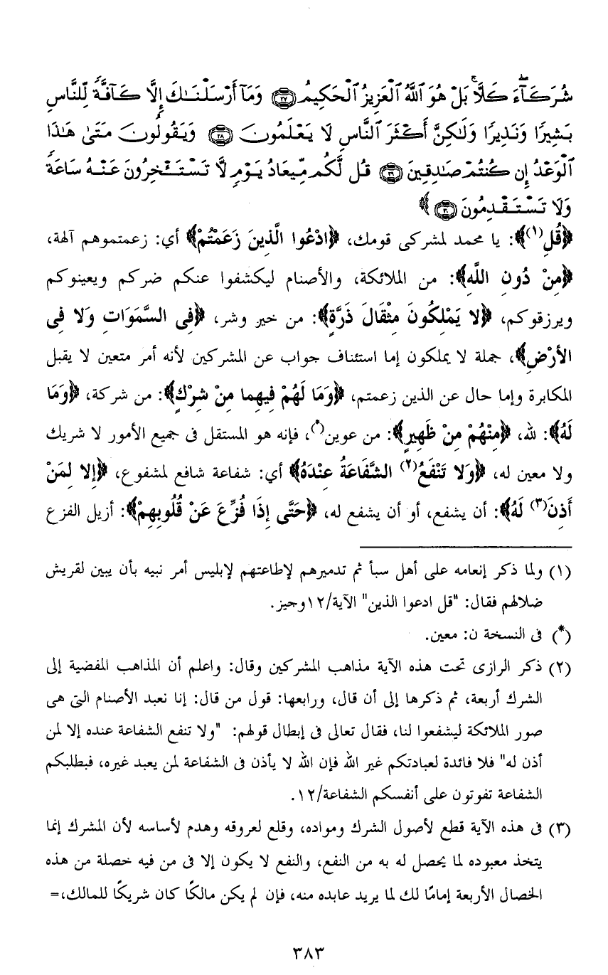(قلِ): يا محمد لمشركي قومك، (ادعُوا الذِينَ زَعَمتمْ) أي: زعمتموهم آلهة، (مِنْ دون اللهِ): من الملائكة، والأصنام ليكشفوا عنكم ضركم ويعينوكم ويرزقوكم، (لا يَمْلِكُونَ مِثْقَالَ ذَرَّةٍ): من خير وشر، (فِى السَّمَاوَاتِ وَلا فِي الأرْضِ)، جملة لا يملكون إما استئناف جواب عن المشركين لأنه أمر متعين لا يقبل المكابرة وإما حال عن الذين زعمتم، (وَمَا لَهُمْ فيهِما مِنْ شِرْكٍ): من شركة، (وَمَا لَه): لله، (منْهُمْ مِنْ ظَهِيرٍ): من عوين، فإنه هو المستقل في جميع الأمور لا شريك ولا معين له، (وَلَا تَنْفَعُ الشَّفَاعَةُ عِنْدَهُ) أي: شفاعة شافع لمشفوع، (إِلا لِمَنْ أَذِنَ لَهُ): أن يشفع، أو أن يشفع له، (حَتَّى إِذَا فُزِّعَ عَنْ قلُوبِهِمْ): أزيل الفزع