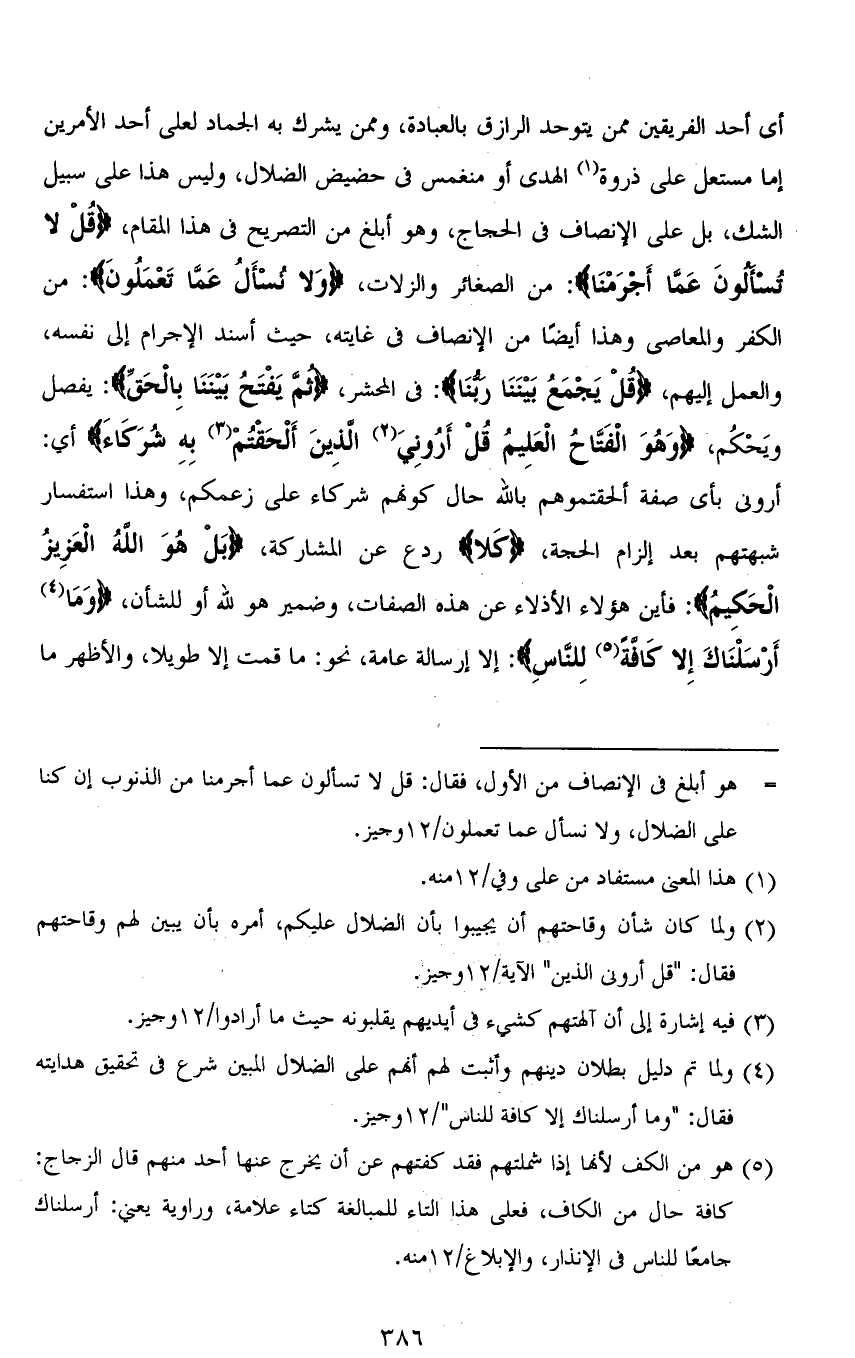 أي أحد الفريقين ممن يتوحد الرازق بالعبادة، وممن يشرك به الجماد لعلى أحد الأمرين إما مستعل على ذروة الهدى أو منغمس في حضيض الضلال، وليس هذا على سبيل الشك، بل على الإنصاف في الحجاج، وهو أبلغ من التصريح في هذا المقام، (قُلْ لا تُسْألونَ عَمَّا أَجْرَمْنَا): من الصغائر والزلات، (وَلَا نُسْأَلُ عَمَّا تَعْمَلُونَ): من الكفر والمعاصي وهذا أيضًا من الإنصاف في غايته، حيث أسند الإجرام إلى نفسه، والعمل إليهم، (قُلْ يَجْمَعُ بَيْنَنَا رَبُّنَا): في المحشر، (ثُمَّ يَفْتَحُ بَيْنَنَا بِالْحَقِّ): يفصل ويَحْكُم، (وَهُوَ الْفَتَّاحُ الْعَلِيمُ قُلْ أَرُونِيَ الَّذِينَ أَلْحَقْتُمْ بِهِ شُرَكاءَ) أي: أروني بأي صفة ألحقتموهم بالله حال كونهم شركاء على زعمكم، وهذا استفسار شبهتهم بعد إلزام الحجة، (كَلَّا) ردع عن المشاركة، (بَلْ هُوَ اللهُ الْعَزِيزُ الْحَكِيمُ): فاين هؤلاء الأذلاء عن هذه الصفات، وضمير هو لله أو للشأن، (وَمَا أَرْسَلْنَاكَ إِلَّا كَافَّةً لِلنَّاسِ): إلا إرسالة عامة، نحو: ما قمت إلا طويلاً، والأظهر ما