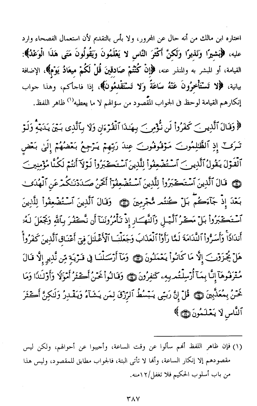 اختاره ابن مالك من أنه حال عن المجرور، ولا بأس بالتقديم لأن استعمال الفصحاء وارد عليه، (بَشِيرًا وَنَذِيرًا وَلَكِنَّ أَكْثَرَ النَّاسِ لَا يَعْلَمُونَ وَيَقُولُونَ مَتَى هَذَا الْوَعْدُ): القيامة، أو المبشر به والمنذر عنه، (إِن كُنتمْ صَادِقِينَ قُلْ لَكُمْ مِيعَادُ يَوْمٍ)، الإضافة بيانية، (لَا تَسْتَأْخِرُونَ عَنْهُ سَاعَةً وَلَا تَسْتَقْدِمُونَ)، إذا فاجأكم، وهذا جواب إنكارهم القيامة لوحظ في الجواب المقصود من سؤالهم لا ما يعطيه ظاهر اللفظ.