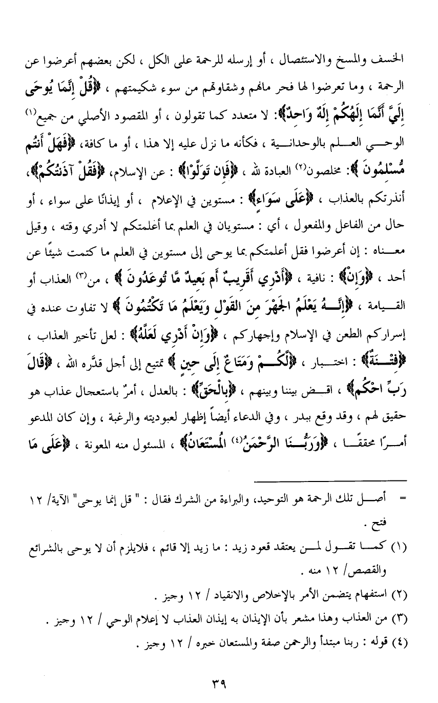 الخسف والمسخ والاستئصال، أو أرسله للرحمة على الكل، لكن بعضهم أعرضوا عن الرحمة، وما تعرضوا لها فحرمانهم وشقاوتهم من سوء شكيمتهم، (قُلْ إِنَّمَا يُوحَى إِلَيَّ أَنَّمَا إِلَهُكُمْ إِلَهٌ وَاحِدٌ): لا متعدد كما تقولون، أو المقصود الأصلي من جميع الوحي العلم بالوحدانية، فكأنه ما نزل عليه إلا هذا، أو ما كافة، (فَهَلْ أَنْتُمْ مُسْلِمُونَ): مخلصون العبادة لله، (فَإِنْ تَوَلَّوْا): عن الإسلام، (فَقُلْ آذَنْتُكُمْ)، أنذرتكم بالعذاب، (عَلَى سَوَاءٍ): مستوين في الإعلام، أو إيذانًا على سواء، أو حال من الفاعل والمفعول، أي: مستويان في العلم بما أعلمتكم لا أدري وقته، وقيل معناه: إن أعرضوا فقل أعلمتكم بما يوحى إلى مستوين في العلم ما كتمت شيئًا عن أحد، (وَإِنْ): نافية، (أَدْرِي أَقَرِيبٌ أَمْ بَعِيدٌ مَا تُوعَدُونَ)، من العذاب أو القيامة، (إِنَّهُ يَعْلَمُ الجَهْرَ مِنَ القَوْلِ وَيَعْلَمُ مَا تَكْتُمُونَ) لا تفاوت عنده في إسراركم الطعن في الإسلام وإجهاركم، (وَإِنْ أَدْرِي لَعَلَّهُ): لعل تأخير العذاب، (فِتْنَةٌ): اختبار، (لَكُمْ وَمَتَاعٌ إِلَى حِينٍ) تمتيع إلى أجل قدَّره الله، (قَالَ رَبِّ احْكُمْ)، اقض بيننا وبينهم، (بِالْحَقِّ) بالعدل، أمرٌ باستعجال عذاب هو حقيق لهم، وقد وقع ببدر، وفي الدعاء أيضًا إظهار لعبوديته والرغبة، وإن كان المدعو أمرًا محققًا، (وَرَبُّنَا الرَّحْمَنُ الْمُسْتَعَانُ)، المسئول منه المعونة، (عَلَى مَا
