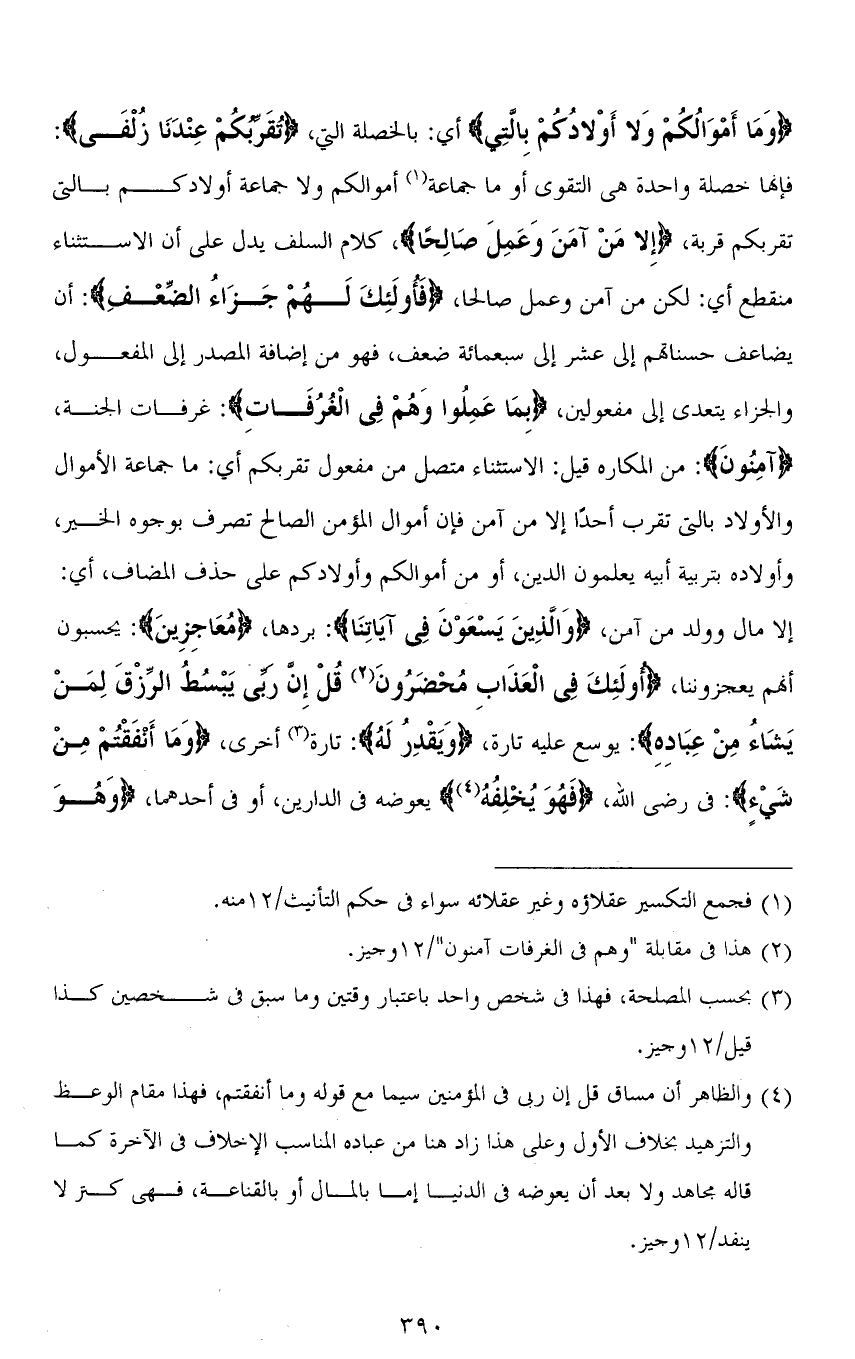 (وَمَا أَمْوَالُكُمْ وَلَا أَوْلَادُكُمْ بِالَّتِي) أي: بالخصلة التي، (تُقَرِّبُكُمْ عِنْدَنَا زُلْفَى): فإنها خصلة واحدة هي التقوى أو ما جماعة أموالكم ولا جماعة أولادكم بالتي تقربكم قربة، (إِلَّا مَنْ آمَنَ وَعَمِلَ صَالِحًا)، كلام السلف يدل على أن الاستثناء منقطع أي: لكن من آمن وعمل صالحًا، (فَأُولَئِكَ لَهُمْ جَزَاءُ الضِّعْفِ): أن يضاعف حسناتهم إلى عشر إلى سبعمائة ضعف، فهو من إضافة المصدر إلى المفعول، والجزاء يتعدى إلى مفعولين، (بِمَا عَمِلُوا وَهُمْ فِي الْغُرُفَاتِ): غرفات الجنة، (آمِنُونَ): من المكاره قيل: الاستثناء متصل من مفعول تقربكم أي: ما جماعة الأموال والأولاد بالتي تقرب أحدًا إلا من آمن فإن أموال المؤمن الصالح تصرف بوجوه الخير، وأولاده بتربية أبيه يعلمون الدين، أو من أموالكم وأولادكم على حذف المضاف، أي: إلا مال وولد من آمن، (وَالَّذِينَ يَسْعَوْنَ فِي آيَاتِنَا): بردها، (مُعَاجِزِينَ): يحسبون أنهم يعجزوننا، (أُولَئِكَ فِي الْعَذَابِ مُحْضَرُونَ قُلْ إِنَّ رَبِّي يَبْسُطُ الرِّزْقَ لِمَنْ يَشَاءُ مِنْ عِبَادِهِ): يوسع عليه تارة، َ (وَيَقْدِرُ لَهُ): تارة أخرى، (وَمَا أَنْفَقْتمْ مِن شَيْءٍ): في رضى الله، (فهوَ يُخْلِفُهُ) يعوضه في الدارين، أو في أحدهما، (وَهو