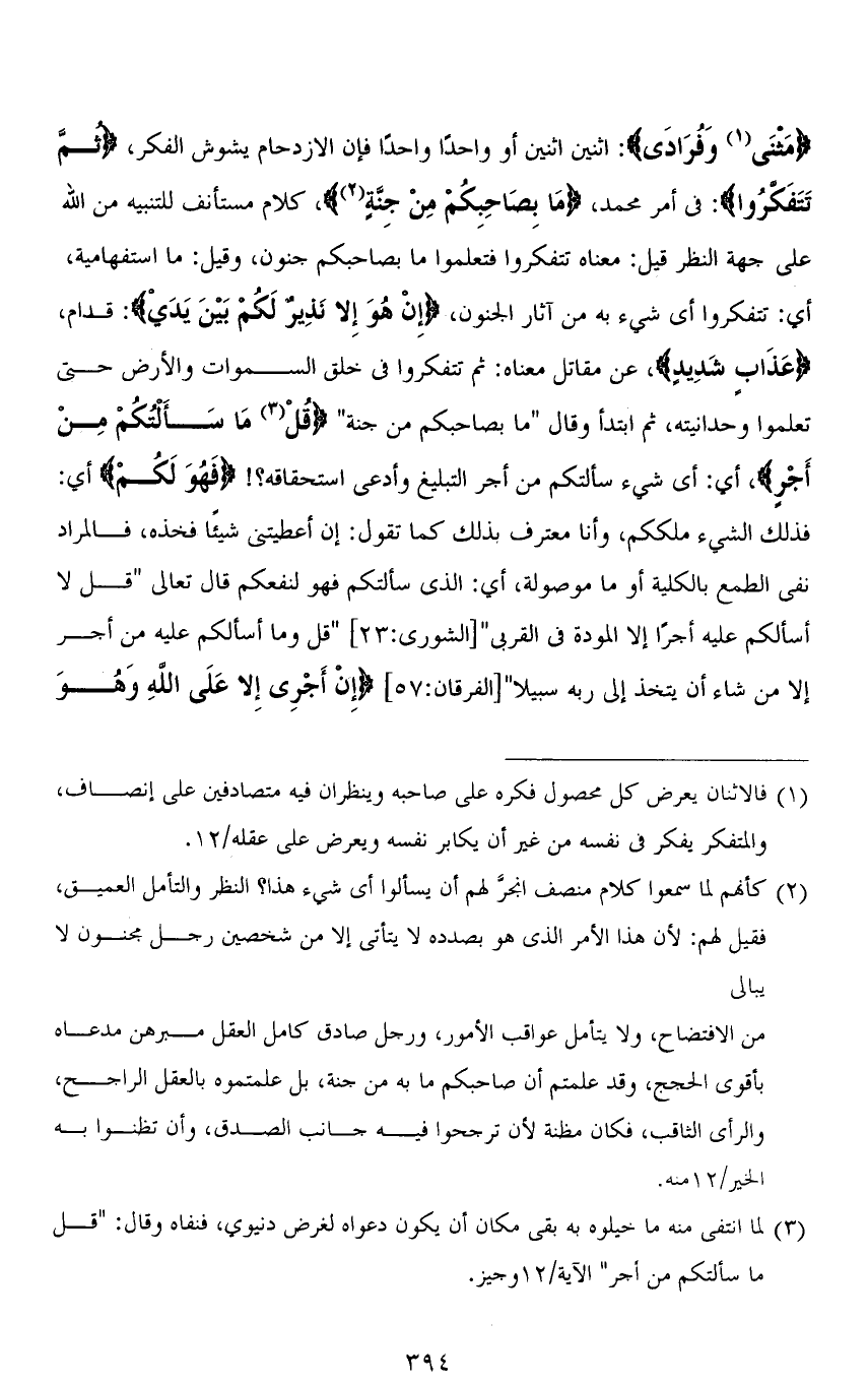 (مَثْنى وَفُرَادَى): اثنين اثنين أو واحدًا واحدًا فإن الازدحام يشوش الفكر، (ثُمَّ تَتَفَكَّرُوا): في أمر محمد، (مَا بِصَاحِبِكُمْ مِنْ جِنَّةٍ)، كلام مستأنف للتبيه من الله على جهة النظر قيل: معناه تتفكروا فتعلموا ما بصاحبكم جنون، وقيل: ما استفهامية، أى: تتفكروا أي شيء به من آثار الجنون، (إِنْ هُوَ إِلَّا نَذِيرٌ لَكُمْ بَيْنَ يَدَيْ): قدام، (عَذَابٍ شَدِيدٍ)، عن مقاتل معناه: ثم تتفكروا في خلق السَّمَاوَات والأرض حتى تعلموا وحدانيته، ثم ابتدأ وقال " ما بصاحبكم من جنة " (قُلْ مَا سَأَلْتُكُمْ مِنْ أَجْرٍ)، أي: أي شيء سألتكم من أجر التبليغ وأدعى استحقاقه؟! (فَهُوَ لَكُمْ) أي: فذلك الشيء ملككم، وأنا معترف بذلك كما تقول: إن أعطيتني شيئًا فخذه، فالمراد نفي الطمع بالكلية أو ما موصولة، أي: الذي سألتكم فهو لنفعكم قال تعالى " قل لا أسألكم عليه أجرًا إلا المودة في القربى " [الشورى: 23] " قُلْ مَا أَسْأَلُكُمْ عَلَيْهِ مِنْ أَجْرٍ إِلَّا مَنْ شَاءَ أَنْ يَتَّخِذَ إِلَى رَبِّهِ سَبِيلًا " [الفرقان: 57] (إِنْ أَجْرِيَ إِلَّا عَلَى اللهِ وَهُوَ