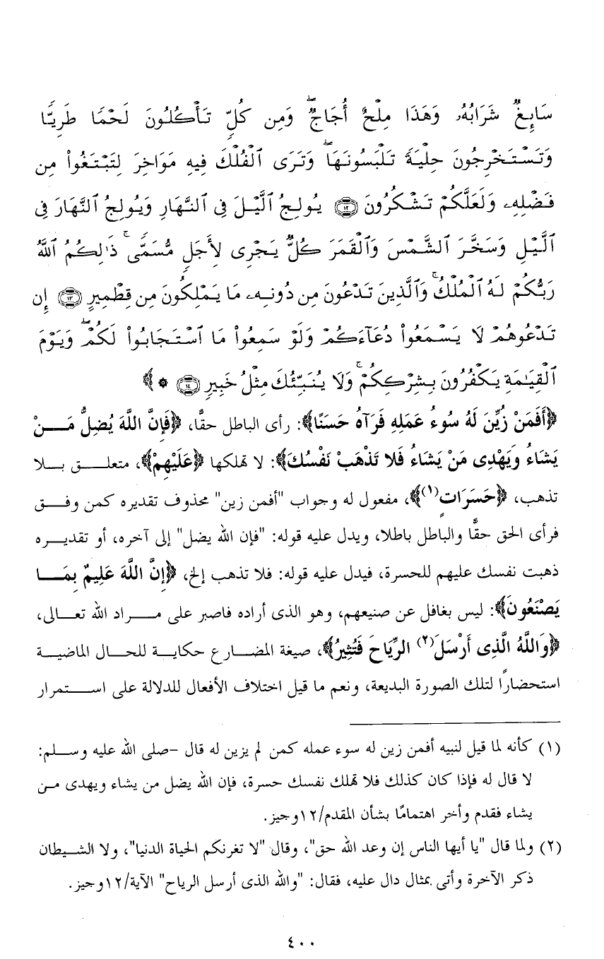 سَائِغٌ شَرَابُهُ وَهَذَا مِلْحٌ أُجَاجٌ وَمِنْ كُلٍّ تَأْكُلُونَ لَحْمًا طَرِيًّا وَتَسْتَخْرِجُونَ حِلْيَةً تَلْبَسُونَهَا وَتَرَى الْفُلْكَ فِيهِ مَوَاخِرَ لِتَبْتَغُوا مِنْ فَضْلِهِ وَلَعَلَّكُمْ تَشْكُرُونَ (12) يُولِجُ اللَّيْلَ فِي النَّهَارِ وَيُولِجُ النَّهَارَ فِي اللَّيْلِ وَسَخَّرَ الشَّمْسَ وَالْقَمَرَ كُلٌّ يَجْرِي لِأَجَلٍ مُسَمًّى ذَلِكُمُ اللهُ رَبُّكُمْ لَهُ الْمُلْكُ وَالَّذِينَ تَدْعُونَ مِنْ دُونِهِ مَا يَمْلِكُونَ مِنْ قِطْمِيرٍ (13) إِنْ تَدْعُوهُمْ لَا يَسْمَعُوا دُعَاءَكُمْ وَلَوْ سَمِعُوا مَا اسْتَجَابُوا لَكُمْ وَيَوْمَ الْقِيَامَةِ يَكْفُرُونَ بِشِرْكِكُمْ وَلَا يُنَبِّئُكَ مِثْلُ خَبِيرٍ (14)