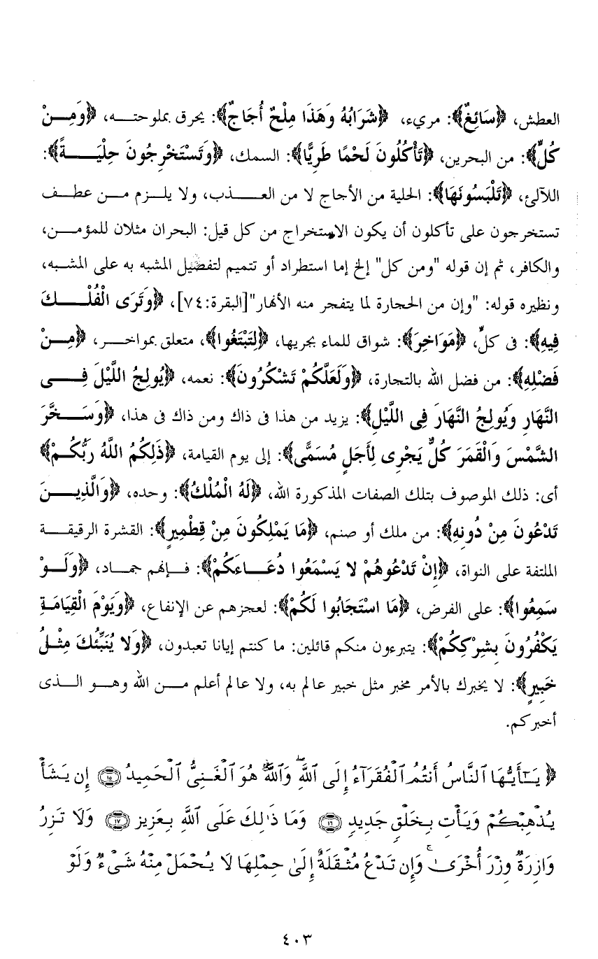 (يَا أَيُّهَا النَّاسُ أَنْتُمُ الْفُقَرَاءُ إِلَى اللهِ وَاللهُ هُوَ الْغَنِيُّ الْحَمِيدُ (15) إِنْ يَشَأْ يُذْهِبْكُمْ وَيَأْتِ بِخَلْقٍ جَدِيدٍ (16) وَمَا ذَلِكَ عَلَى اللهِ بِعَزِيزٍ (17) وَلَا تَزِرُ وَازِرَةٌ وِزْرَ أُخْرَى وَإِنْ تَدْعُ مُثْقَلَةٌ إِلَى حِمْلِهَا لَا يُحْمَلْ مِنْهُ شَيْءٌ وَلَوْ