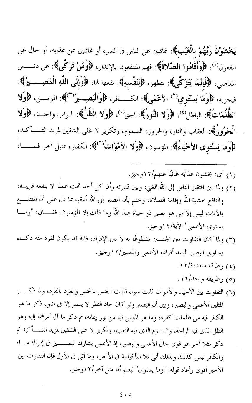 يَخْشَوْنَ رَبَّهُمْ بِالْغَيْبِ): غائبين عن الناس في السر، أو غائبين عن عذابه، أو حال عن المفعول، (وَأَقَامُوا الصَّلَاةَ): فهم المنتفعون بالإنذار، (وَمَنْ تَزَكَّى): عن دنس المعاصي، (فَإِنَّمَا يَتَزَكَّى): يتطهر، (لِنَفْسِهِ): نفعها لها، (وَإِلَى اللهِ الْمَصِيرُ): فيجزيه، (وَمَا يَسْتَوِي الأعْمَى): الكافر، (وَالْبَصيرُ): المؤمن، (وَلَا الظُّلُمَاتُ): الباطل، (وَلا النُّورُ): الحق، (وَلَا الظِّلُّ): الثواب والجنة، (وَلا وَلَا الْحَرُورُ): العقاب والنار، والحرور: السموم، وتكرير لا على الشقين لمزيد التأكيد، (وَمَا يَسْتَوِي الْأَحْيَاءُ): المؤمنون، (وَلَا الْأَمْوَاتُ): الكفار، تمثيل آخر لهما،